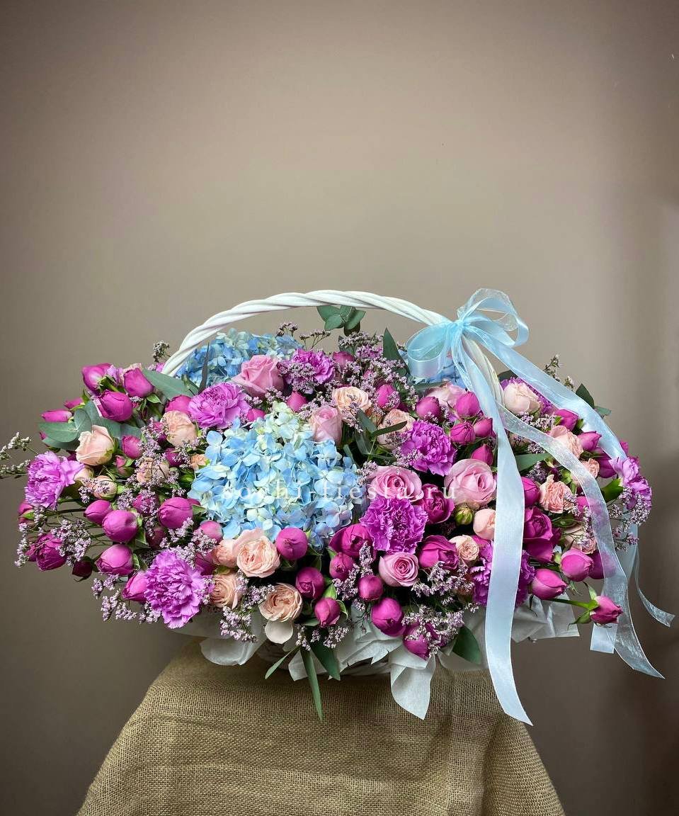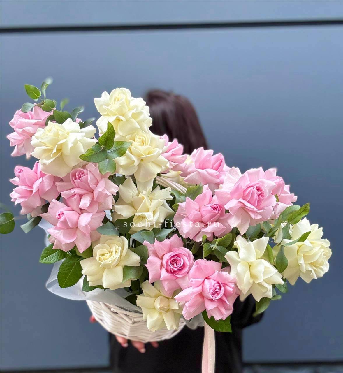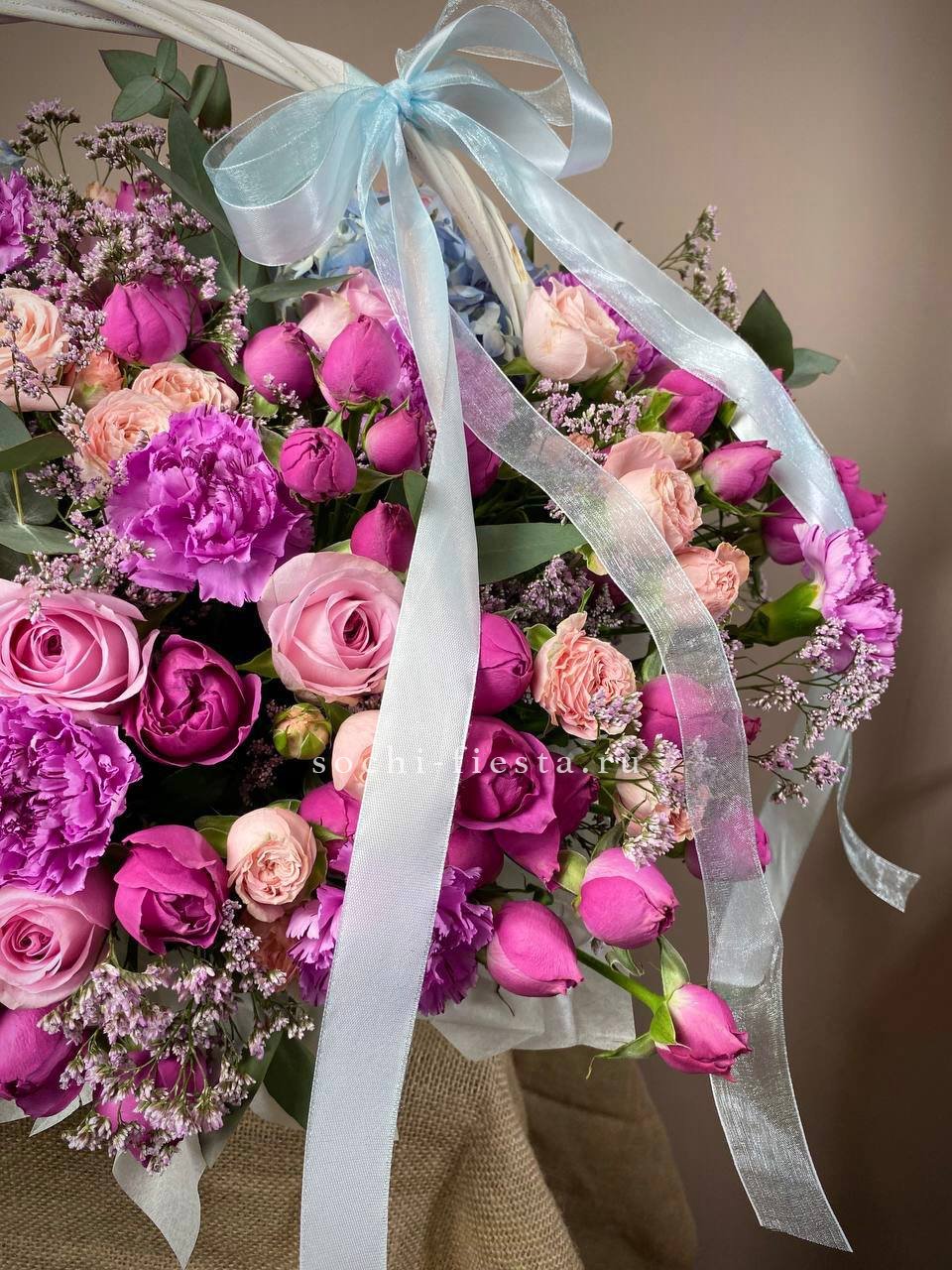Плетеная корзина вмещает густую композицию из лилий с добавлением эвкалипта. Объемная форма создает впечатление цветущего сада, собранного в одном месте.