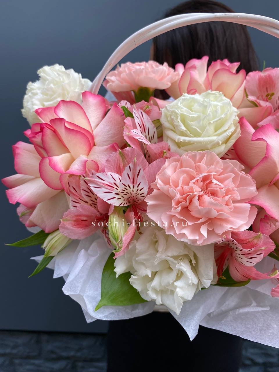 розы нежных оттенков (по возможности джумилия),эустома, диантусы,  гербера, альстромерии,  лента, корзина