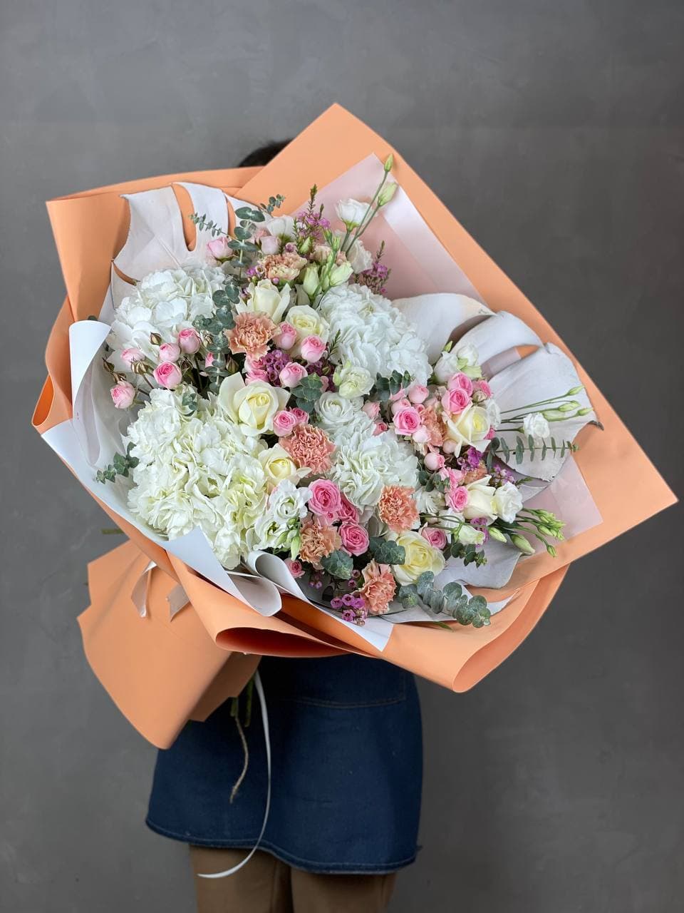 Объемная авторская работа с пионовидными розами и гортензией в пастельной гамме. Листья монстеры и эвкалипт добавляют графику, хамелациум создает дымку вокруг крупных бутонов.