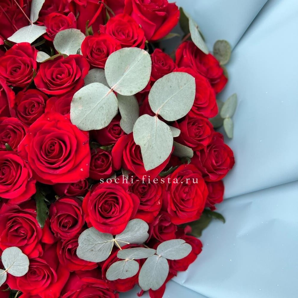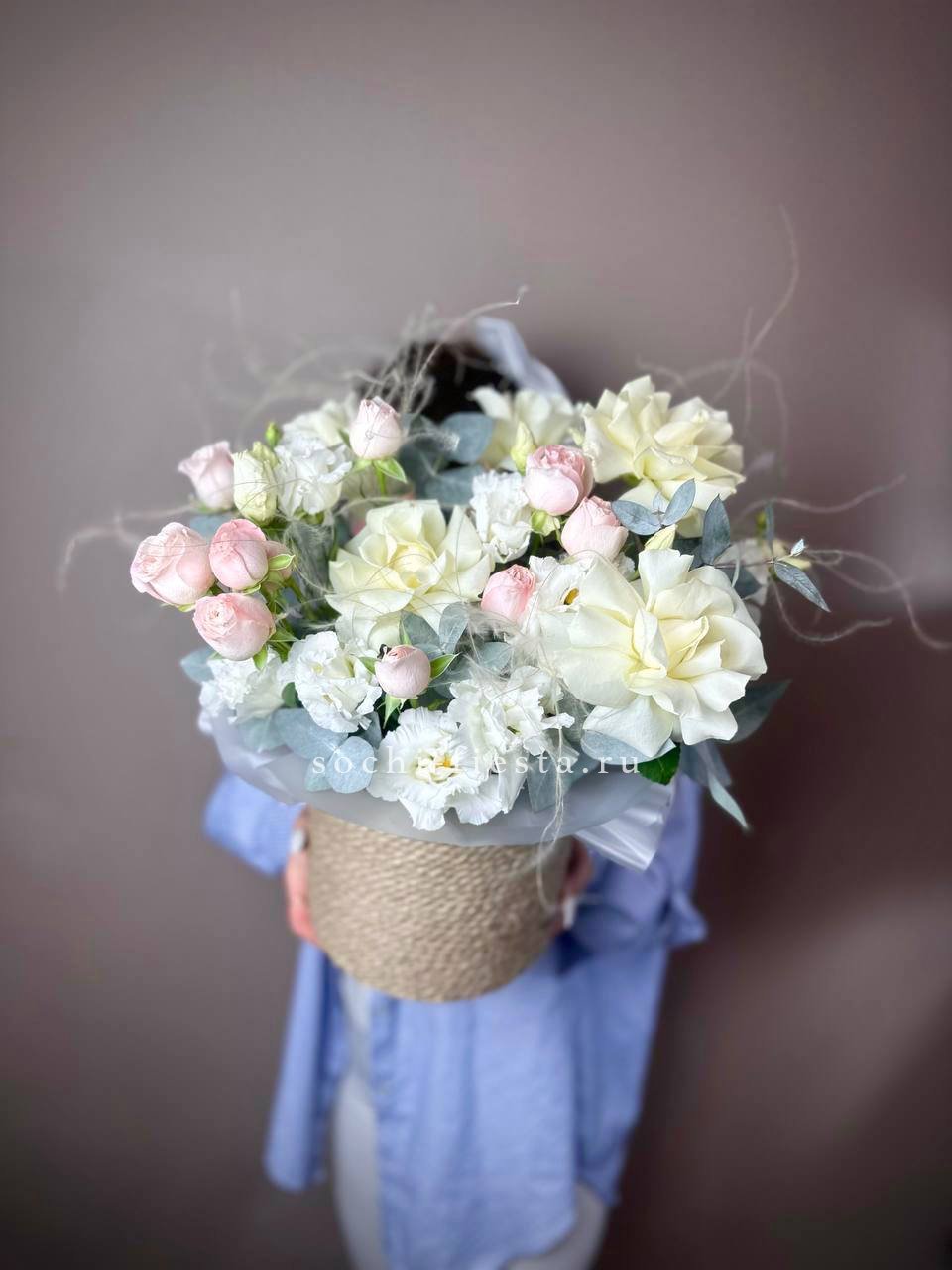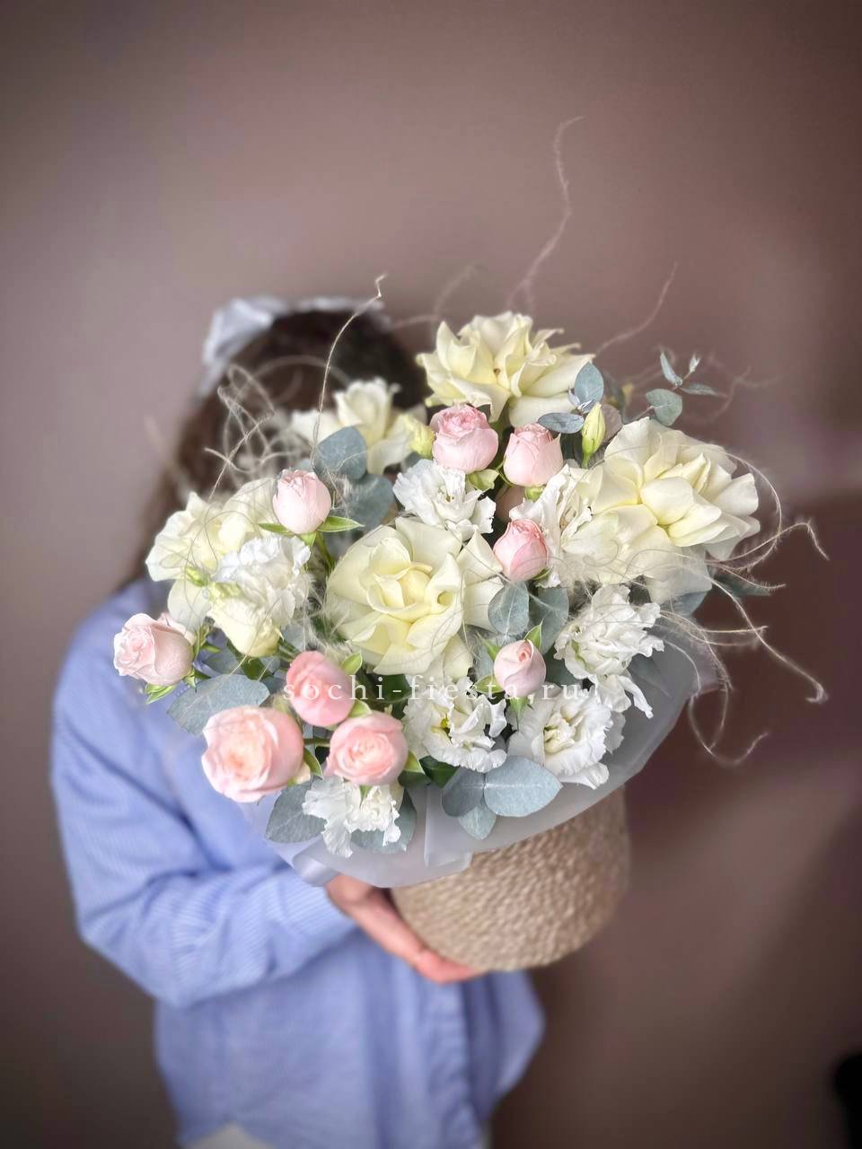 розы, кустовые розы, гортензия, маттиола (или аналог вне сезона), эустома, эвкалипт, лента, дизайнерская упаковка.