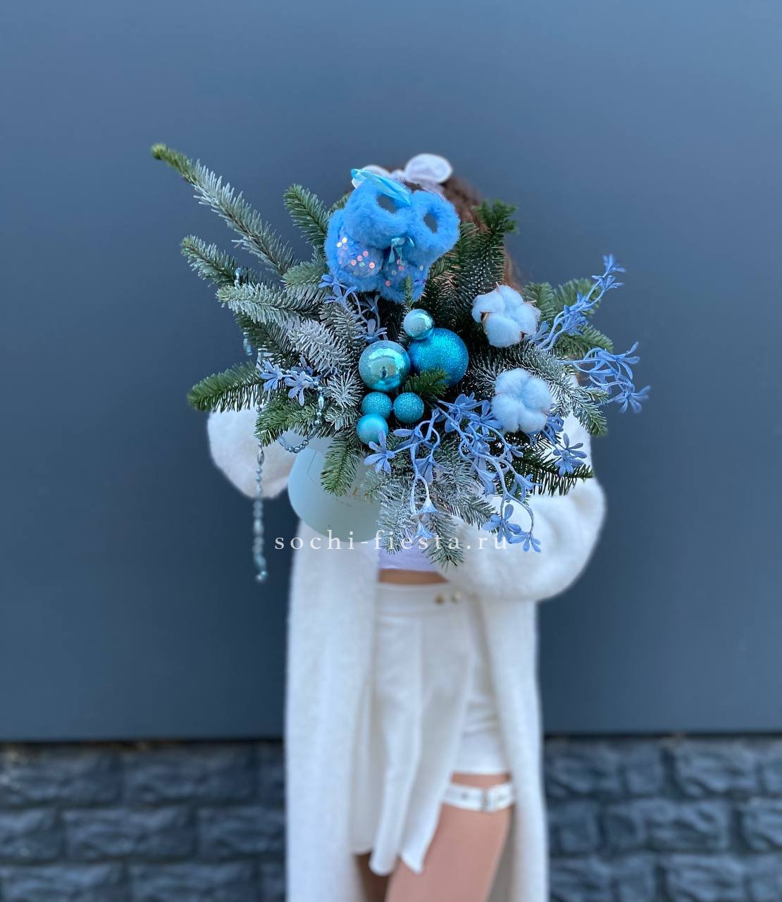 Новогодняя композиция в цилиндре с веточками нобилиса и миниатюрными сапожками создает уютную зимнюю историю. Голубые игрушки и декоративные элементы вносят свежую ноту в традиционную праздничную гамму.