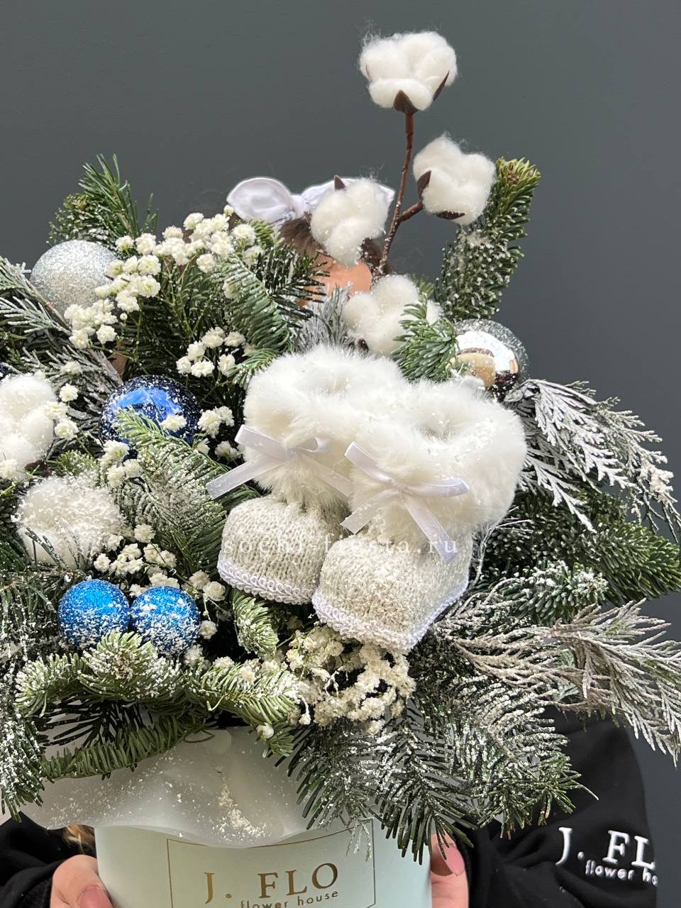 Датский нобилис сочетается с воздушной гипсофилой и красными игрушками в праздничном боксе. Хлопок и декоративные сапожки создают тёплую зимнюю картину прямо на столе.