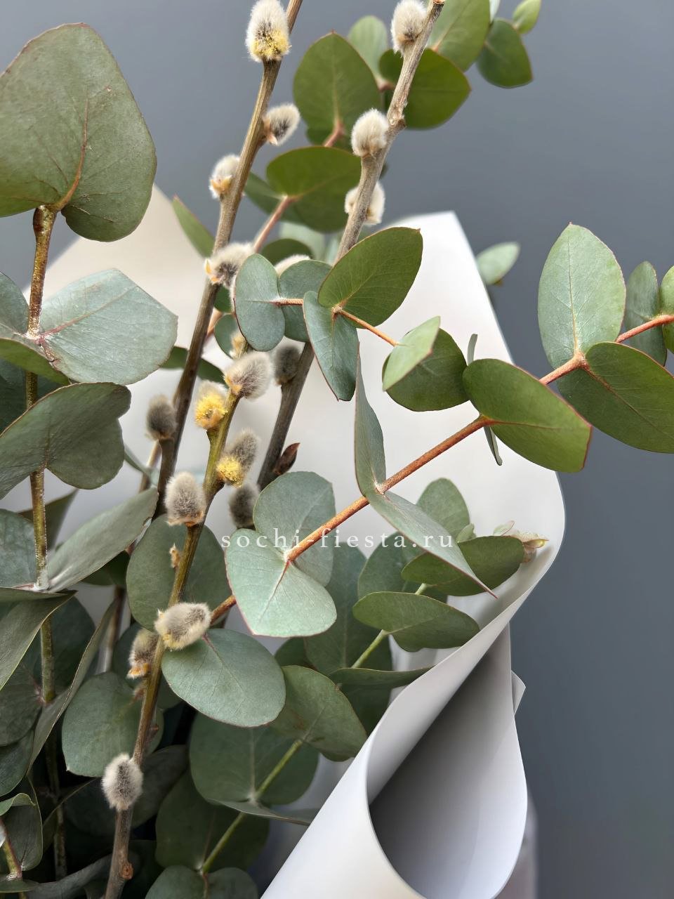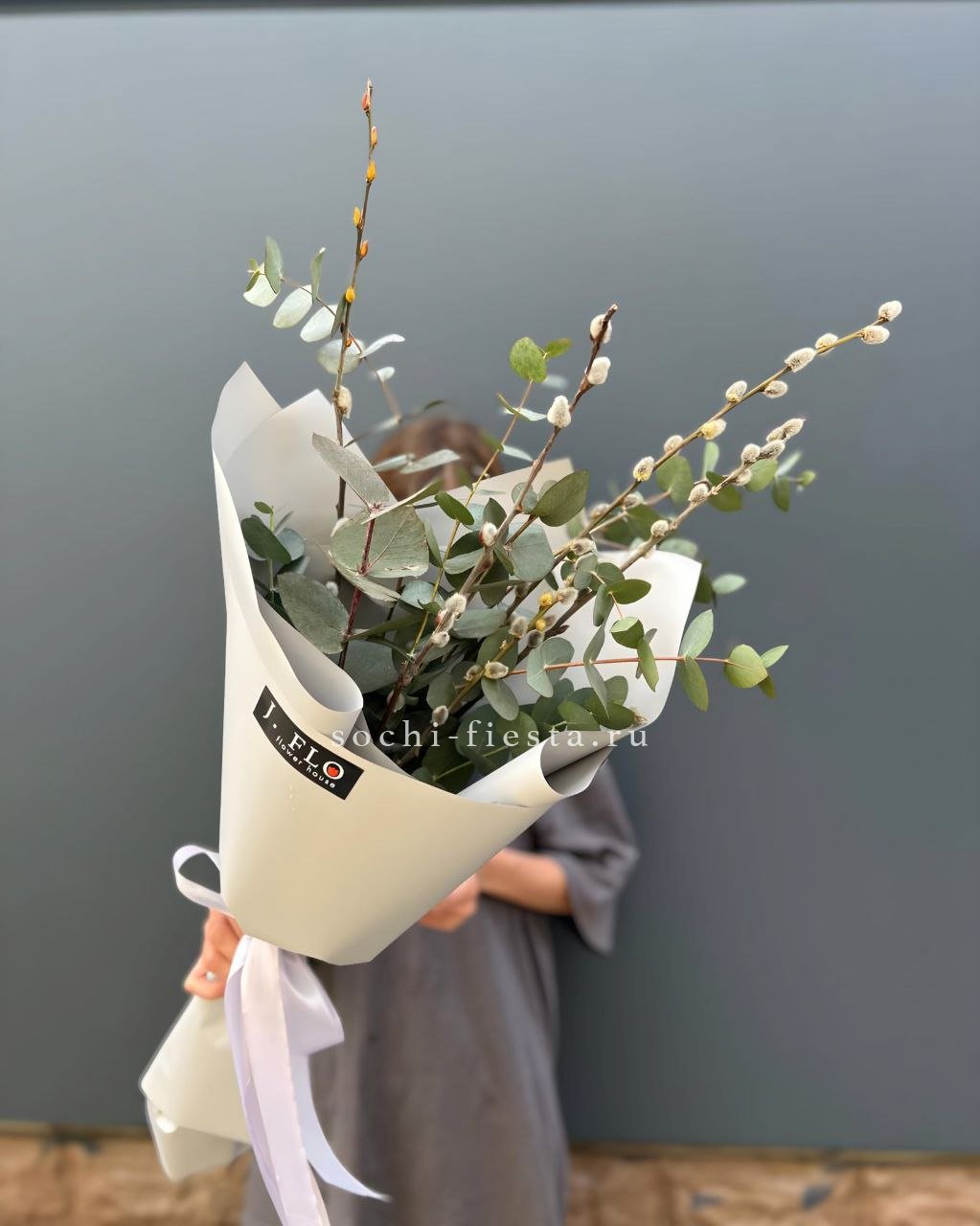 Цветочная композиция идеальна для Православных Праздников! Состав выполнен из белых роз, вербы, сирени, диантусов и озотамнуса.