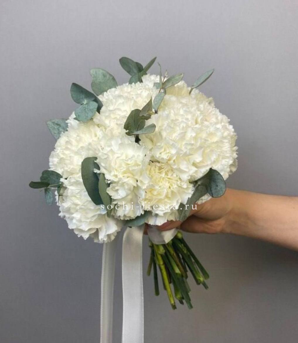 Девятнадцать бутонов эустомы раскрываются слоями воздушных лепестков создавая мягкую текстурную глубину. Эвкалипт добавляет свежести этому монохромному свадебному решению.