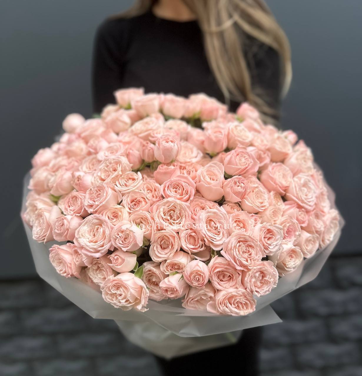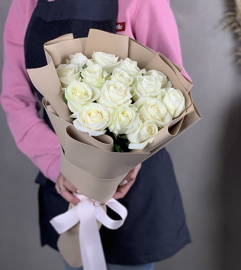 Состав: 27 кремовых роз, лента, дизайнерская пленка или крафт