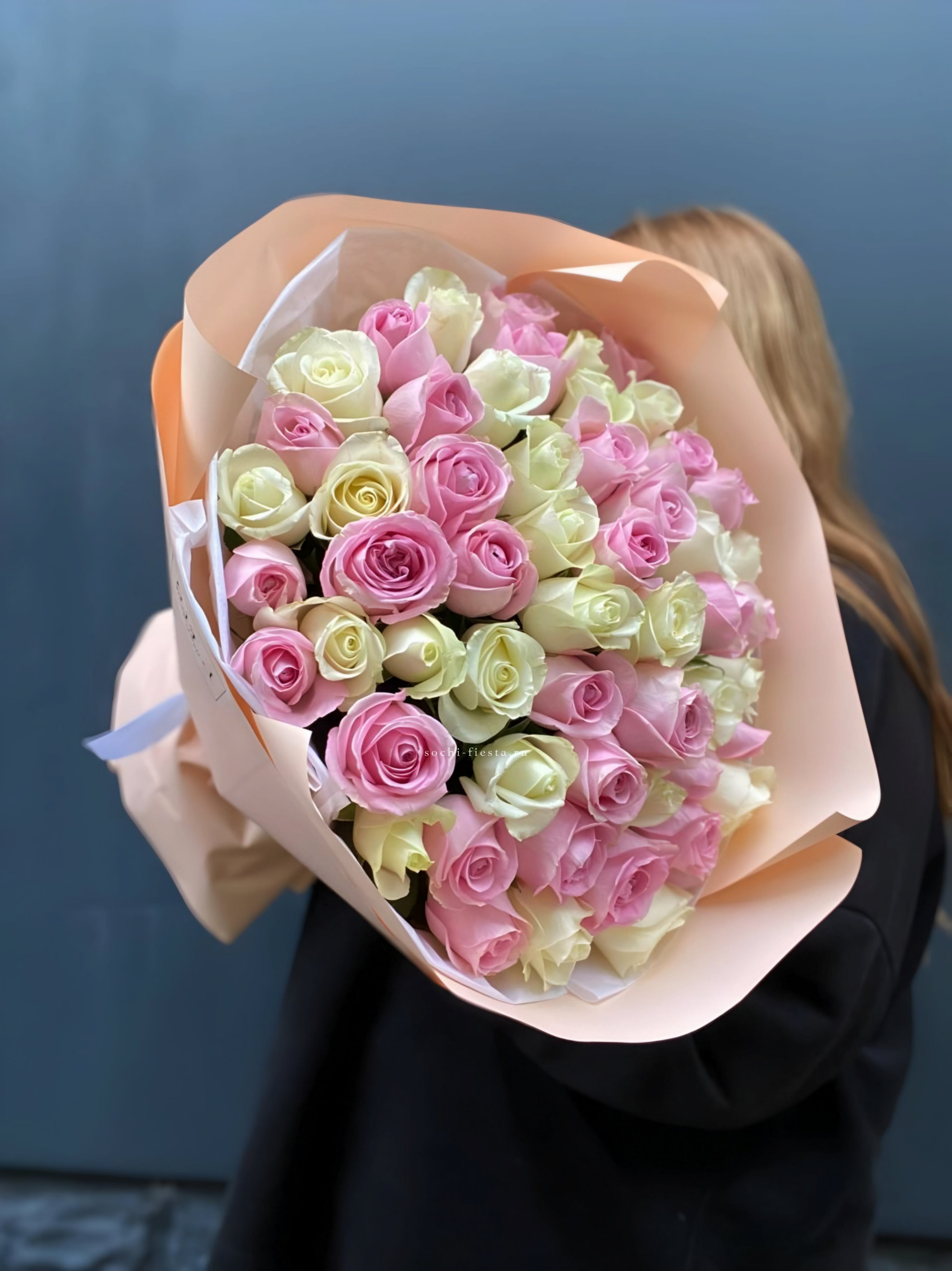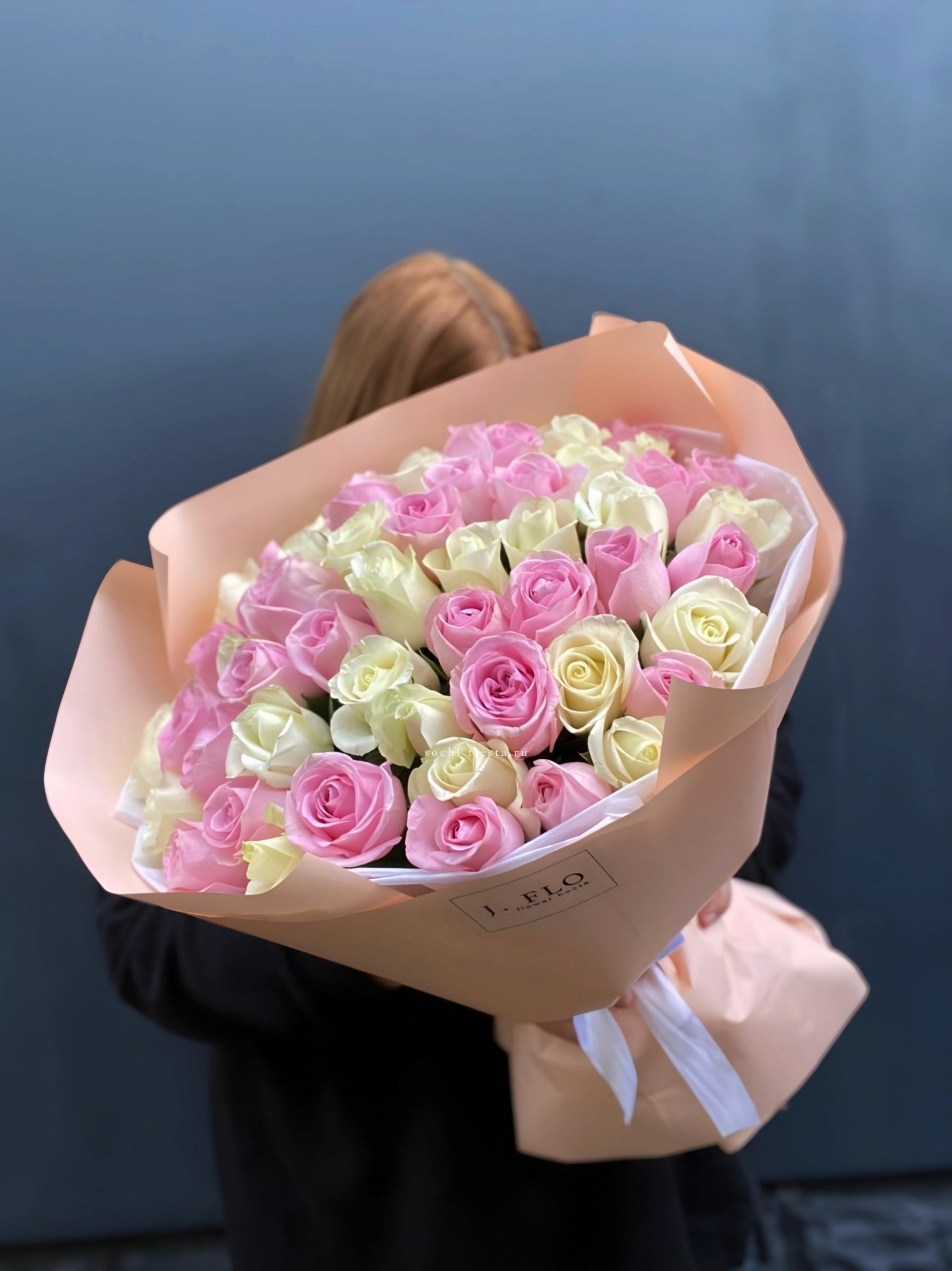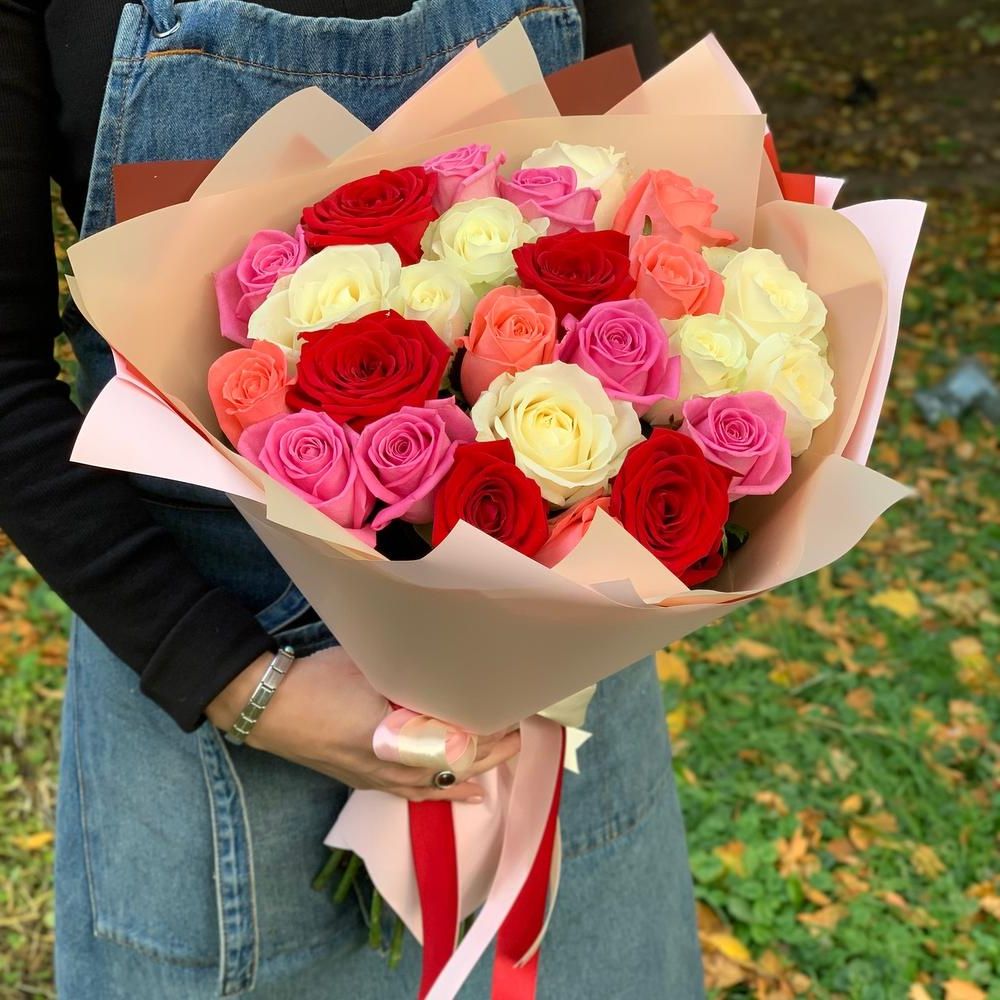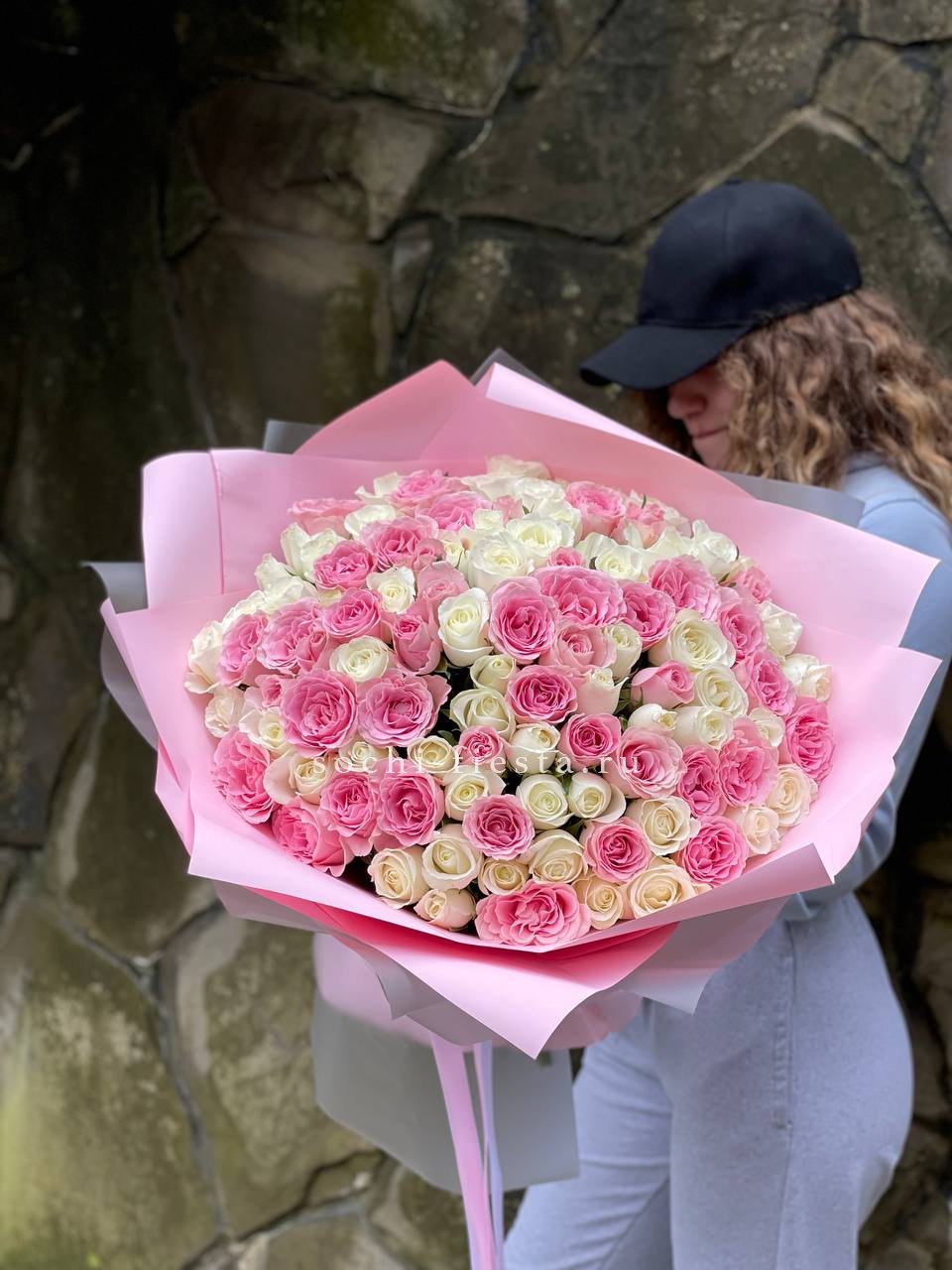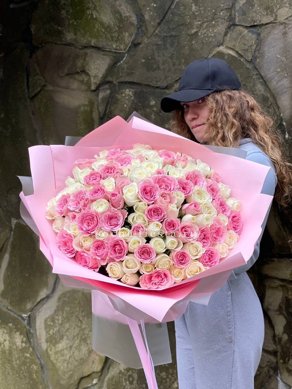 Длинные стебли и крупные бутоны в палитре микс создают букет с графичным силуэтом. Сто одна роза выстраивается в плотную композицию с выразительной вертикалью.