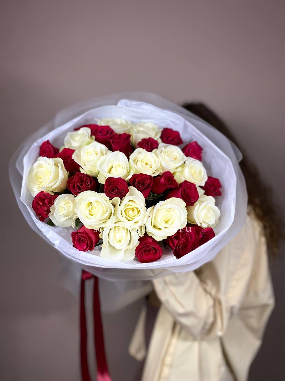 Сорок пять бутонов формируют пышную композицию с заметным присутствием в любом пространстве. Красные и белые розы раскрываются постепенно, сохраняя свежесть несколько дней.