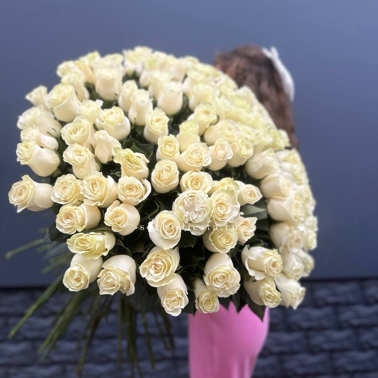 Двадцать пять белых роз образуют объёмную композицию с выразительным силуэтом. Плотная сборка и ритмичное расположение бутонов создают графичное впечатление.