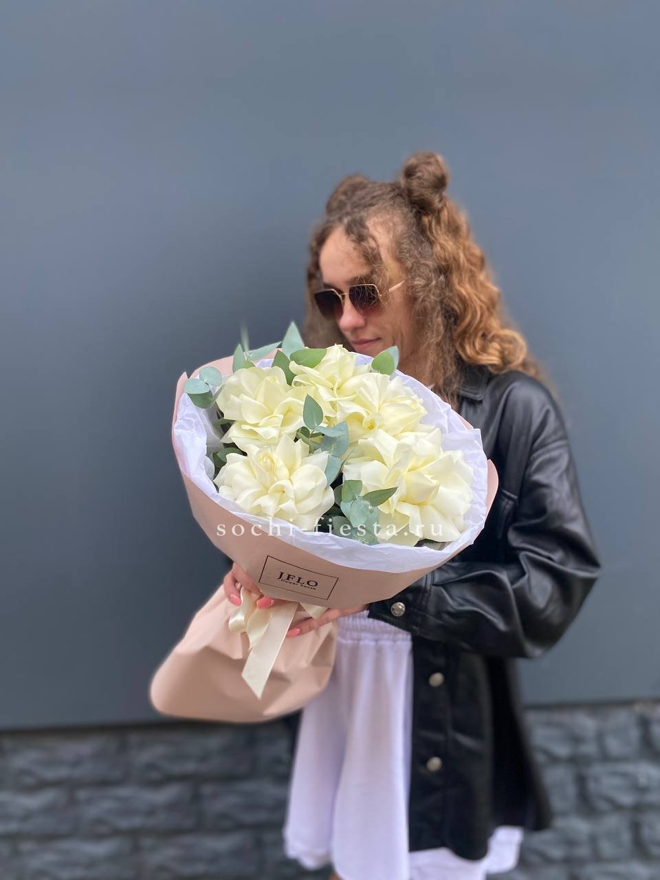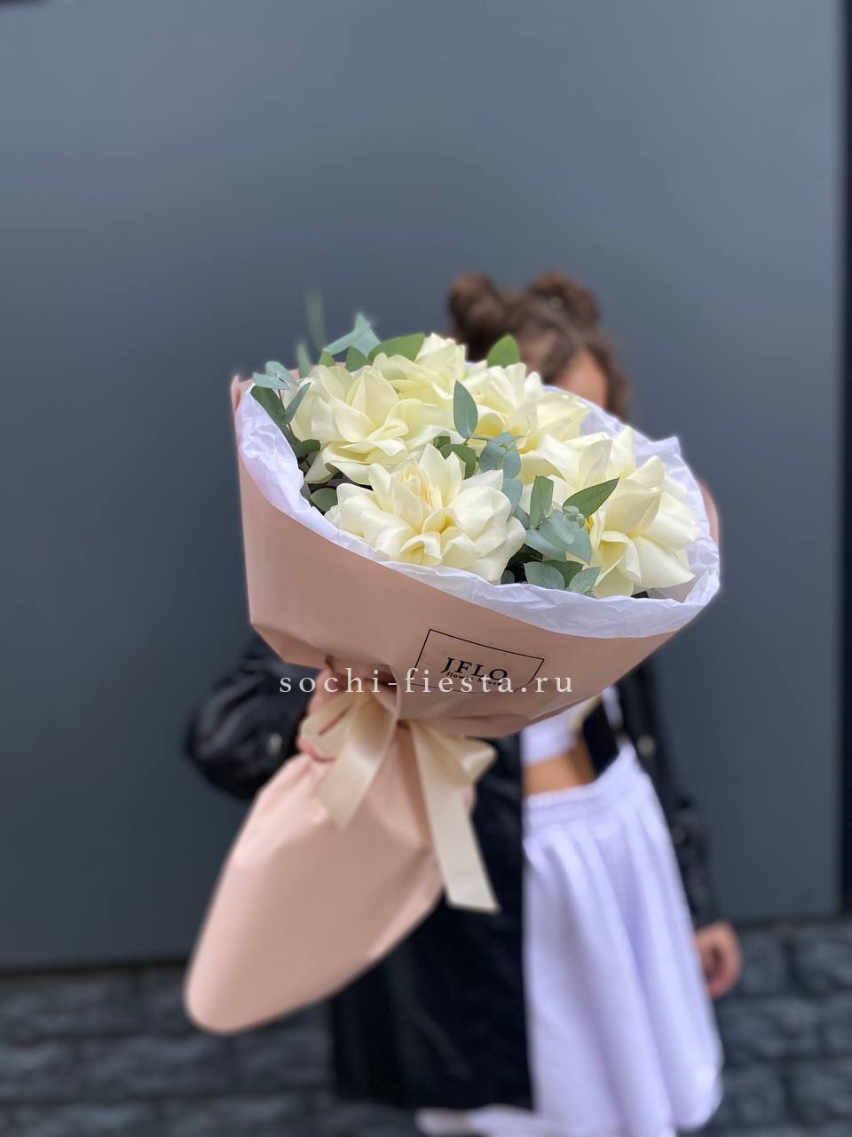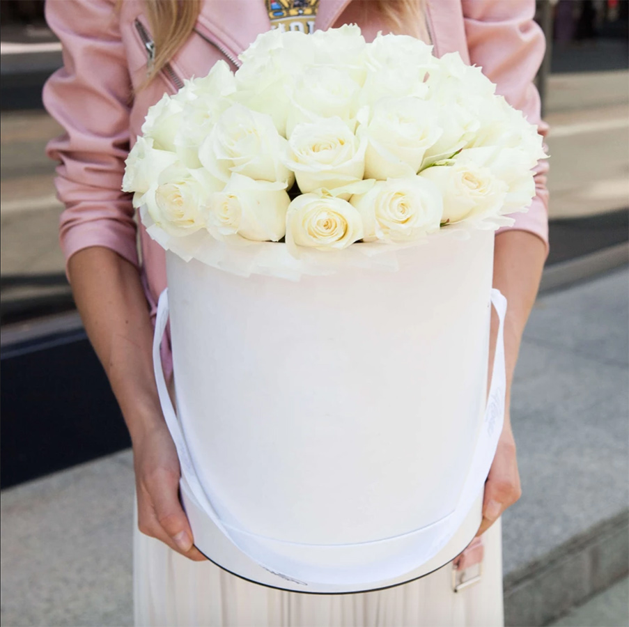 Тридцать один белоснежный бутон собран в плотную округлую форму и дополнен серебристыми ветками эвкалипта. Белый крафт сохраняет природную графику композиции и подчёркивает её объём.