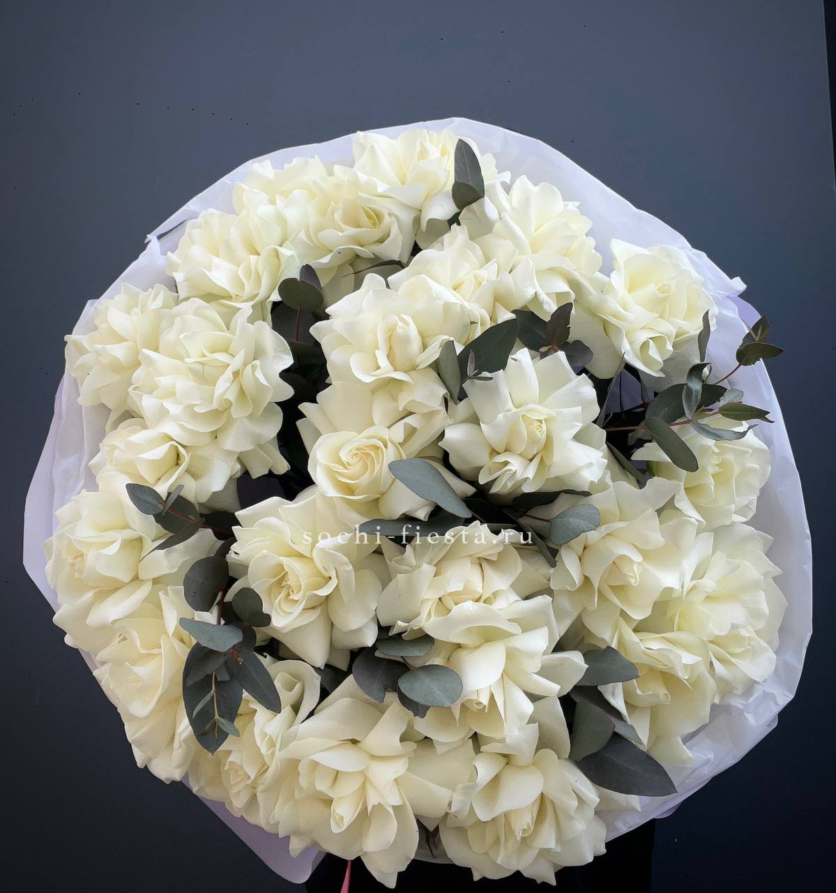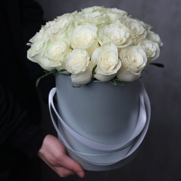 Тридцать пять белых бутонов образуют плотный монохромный ансамбль. Классическая форма и чистота оттенка позволяют букету звучать самодостаточно в любом интерьере.