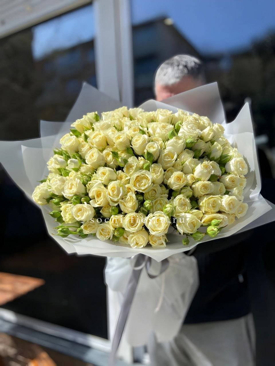 Тридцать девять бутонов образуют плотную белоснежную сферу. Каждый цветок раскрывается постепенно, сохраняя свежесть и форму на протяжении многих дней. Классика в чистом виде.