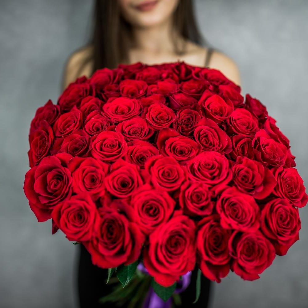 Полсотни алых бутонов образуют объемную композицию с выразительным присутствием. Классическая форма сохраняет четкость линий и долго радует свежестью.