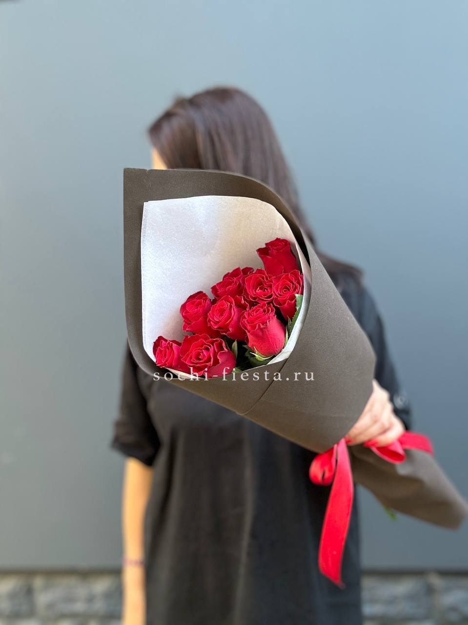 красные розы, лента, крафт.