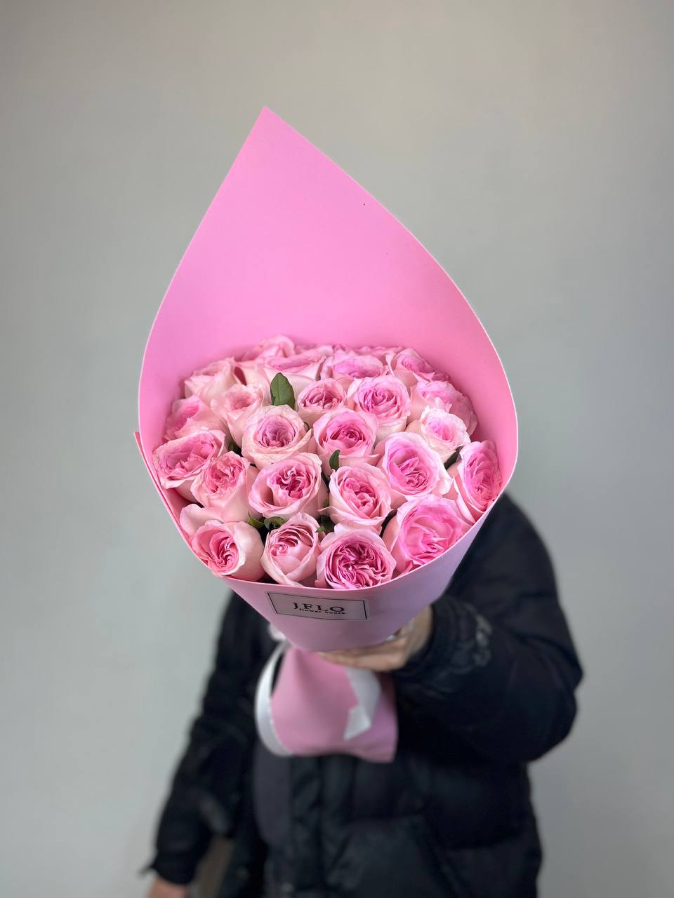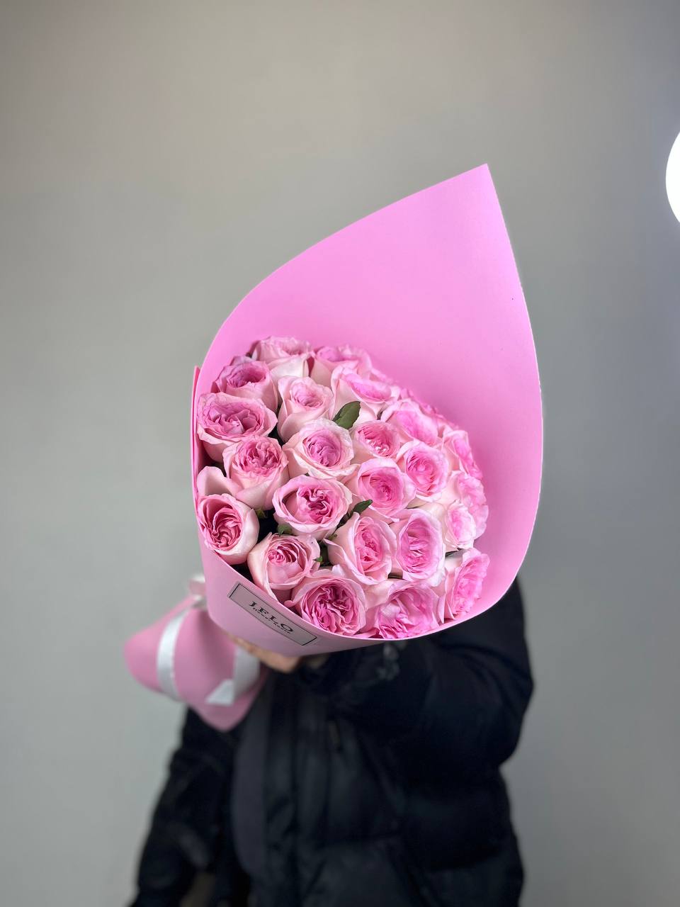 Девять бутонов собраны в компактную форму и обернуты крафтом. Розовый оттенок мягкий и натуральный. Букет занимает мало места и долго сохраняет свежесть.