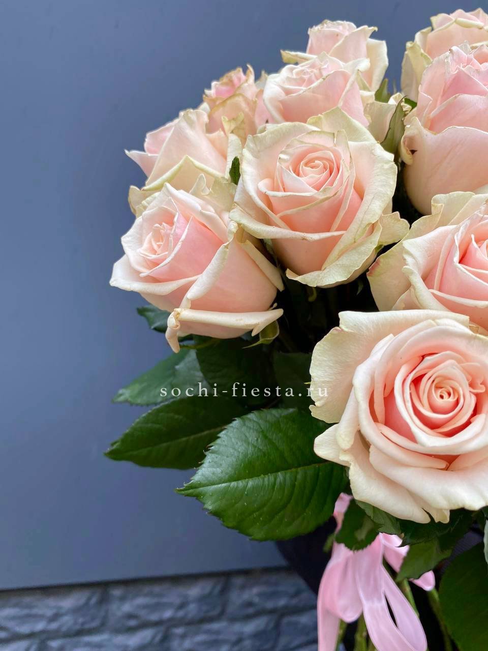Пятнадцать роз на удлиненных стеблях выглядят графично и современно. Кремовые лепестки сохраняют свежесть и форму в течение долгого времени.