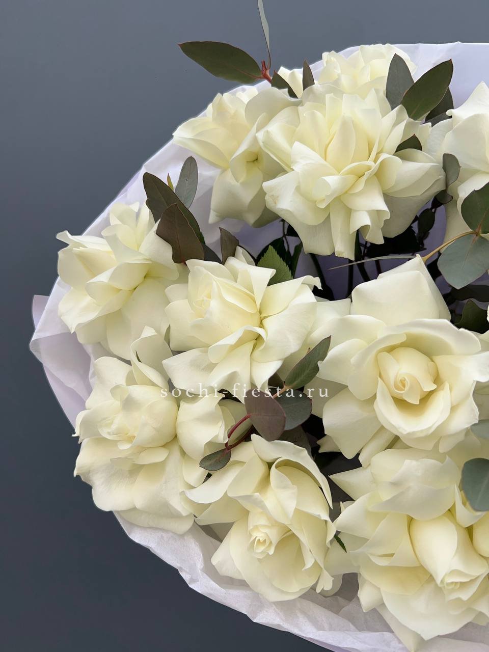 Тринадцать вывернутых французских роз сочетаются с серебристым эвкалиптом. Белые головки с волнистыми лепестками образуют воздушное облако.