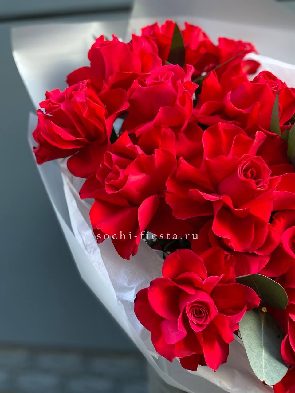 французские розы - 11 шт., эвкалипт-1шт, лента, авторская упаковка.