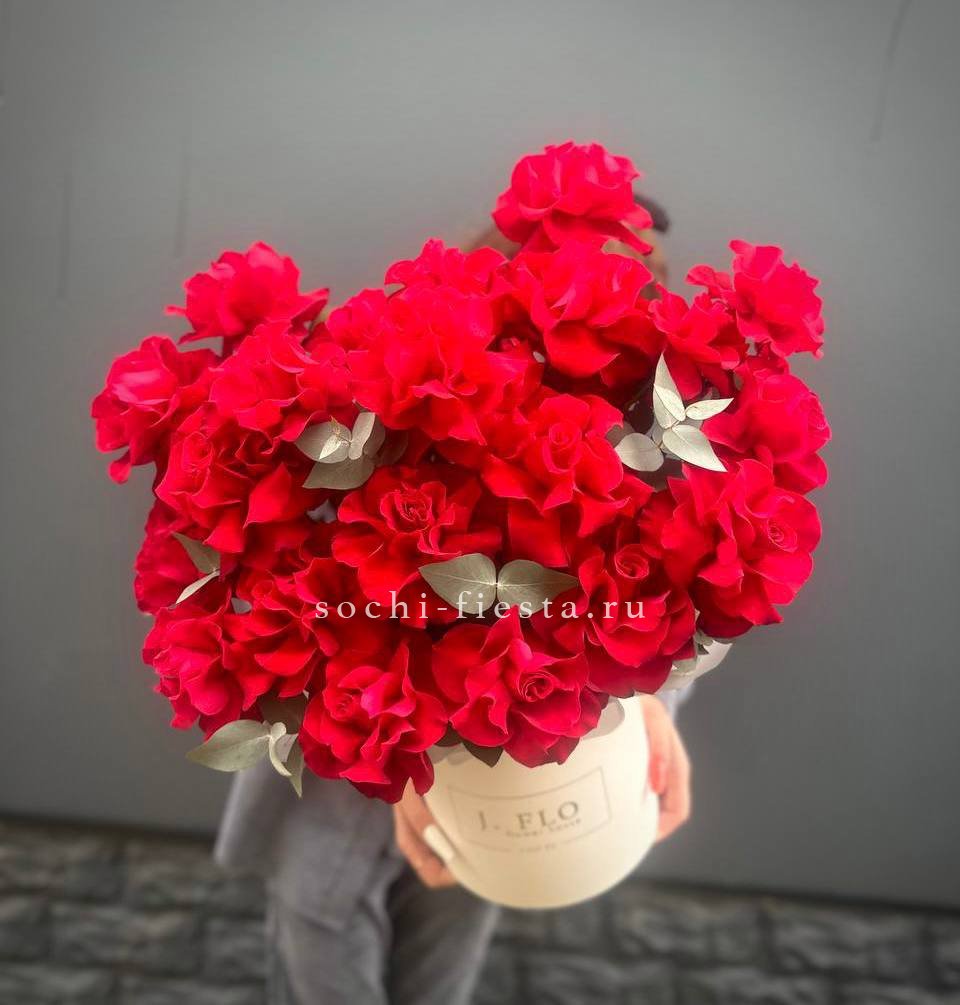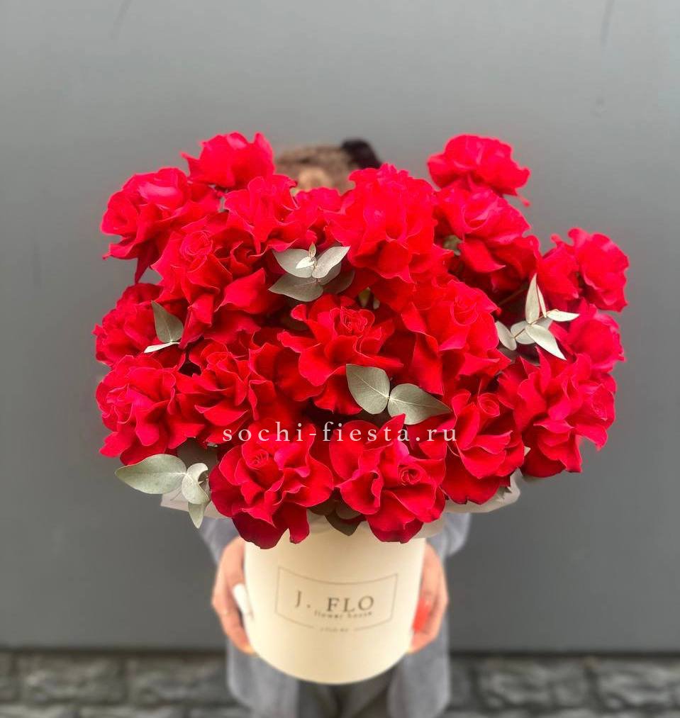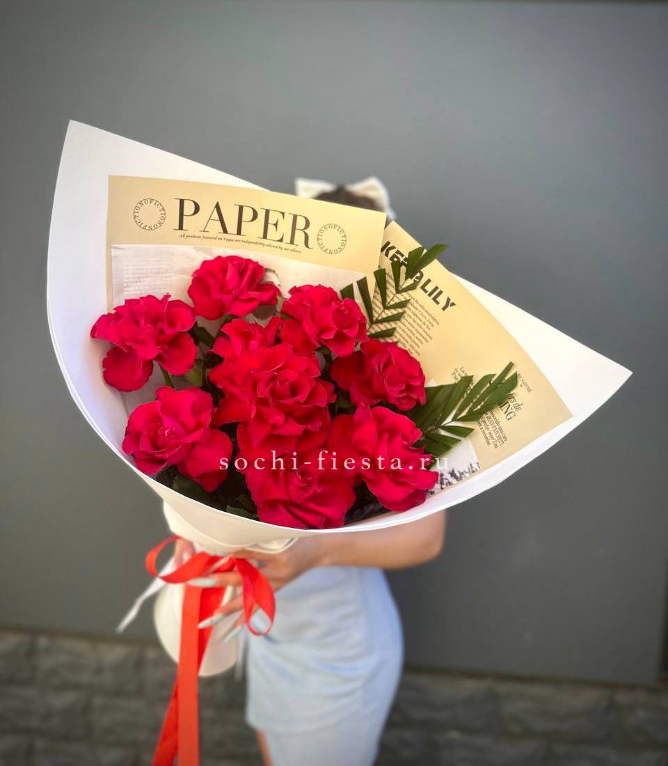 Французские розы собраны в плотную округлую форму, где каждый бутон раскрывается слоями. Веточка эвкалипта добавляет графичности общей композиции. Букет из одиннадцати роз держит форму и выглядит завершенно в авторской упаковке.