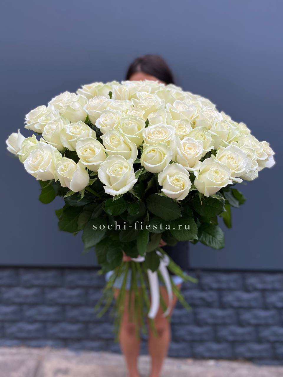 Тридцать один белоснежный бутон собран в высокий монохромный букет с чистым силуэтом. Голландские розы образуют плотную воздушную форму и впечатляют присутствием в любом пространстве.