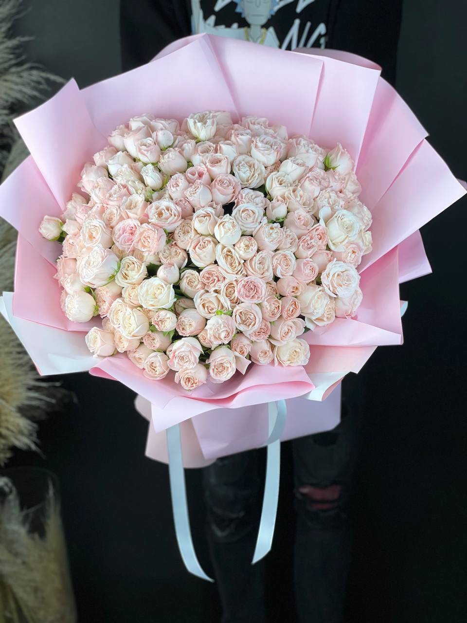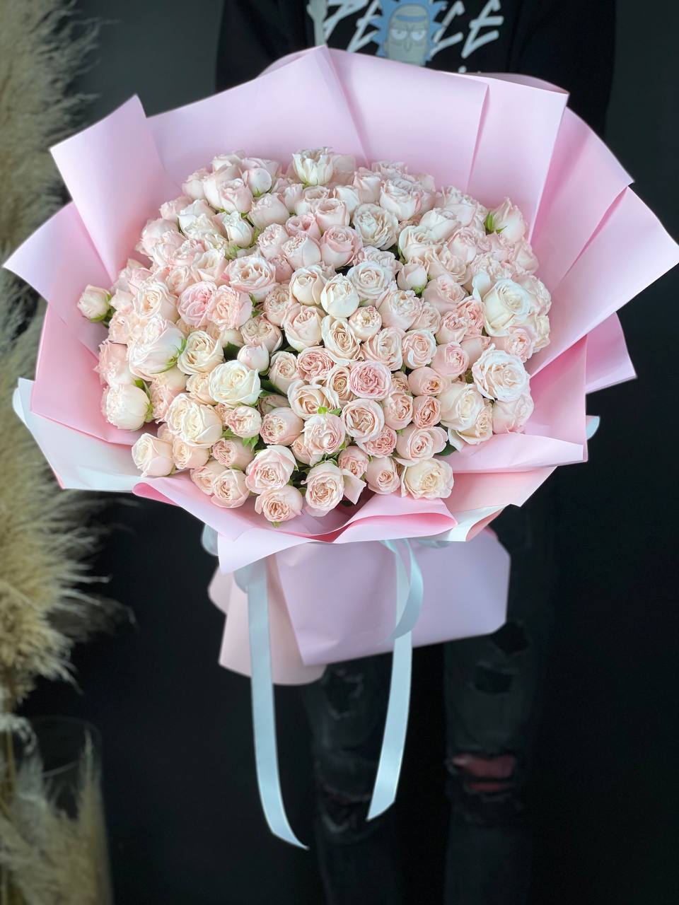 Двадцать пять кустовых роз Бомбастик собраны в пышную композицию с выраженной округлой формой. Плотные многолепестковые бутоны располагаются близко друг к другу, создавая насыщенный визуальный ритм и объемную структуру букета.