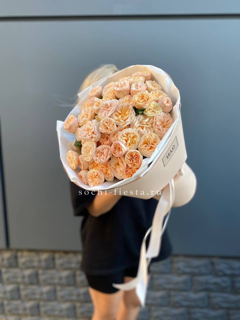 кустовая пионовидная роза, лента, дизайнерская упаковка.