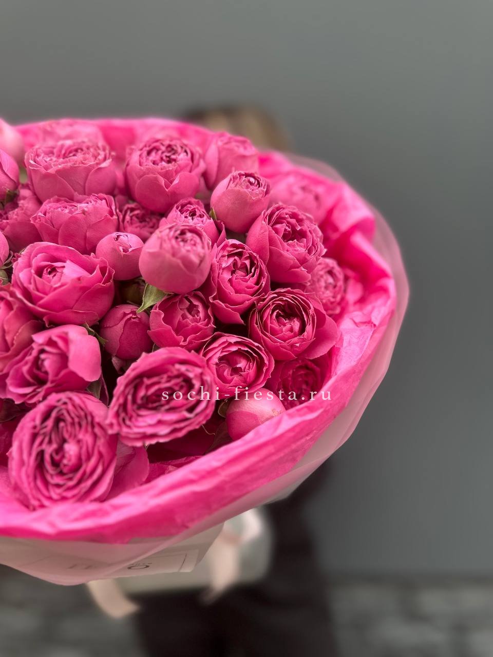 Двадцать пять пионовидных роз в плотной округлой форме создают объёмное облако нежно-розового оттенка. Сорт Pink X-Pression с густомахровыми бутонами собран под ленту без дополнительного декора.