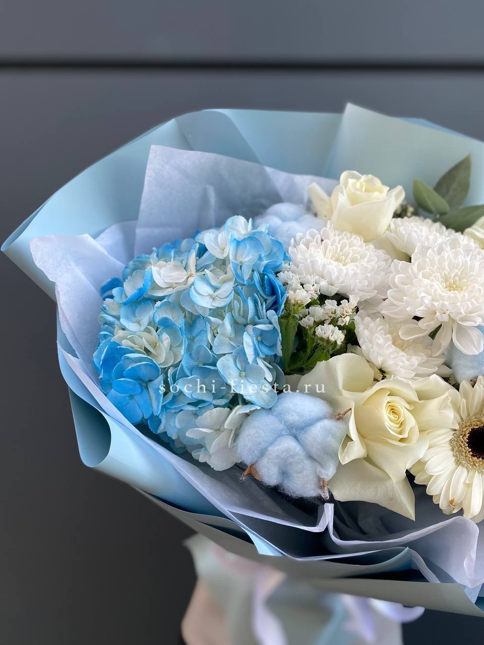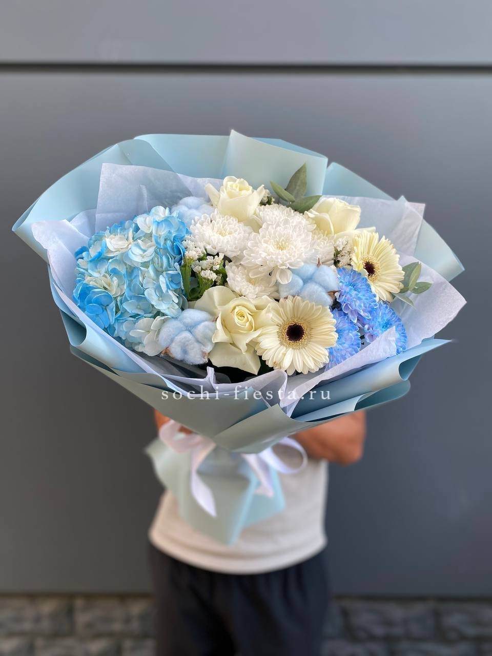 гортензия, герберы, эустомы, розы, диантус, эвкалипт, лента, дизайнерская упаковка.