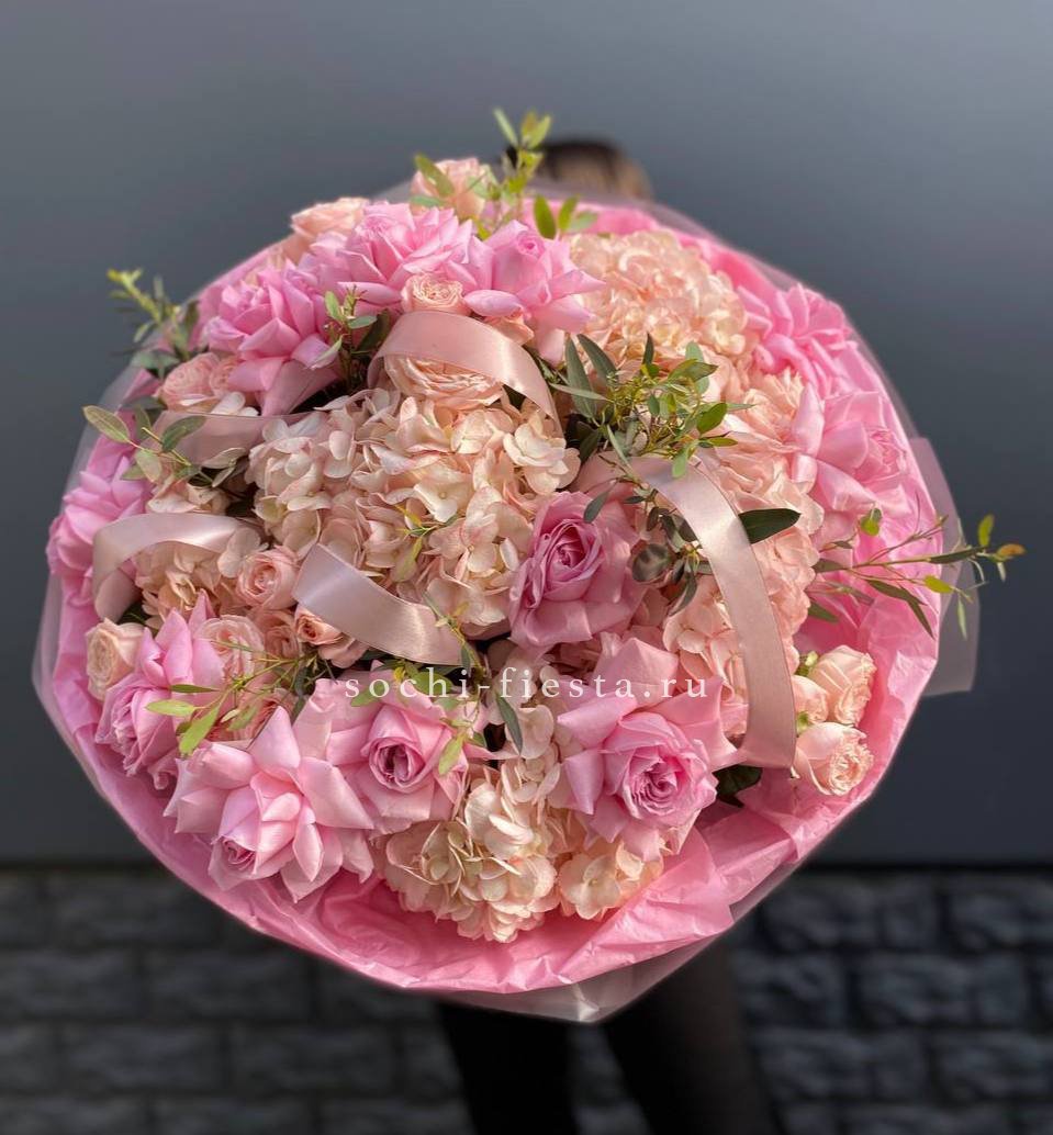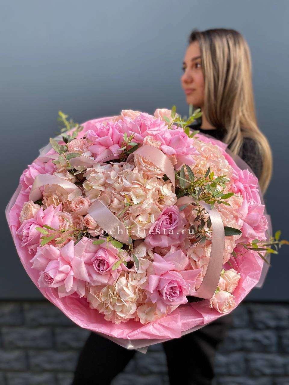 гортензия, розы джумилия, бомбастик, альстромерия, маттиола, чико, авторское оформление.