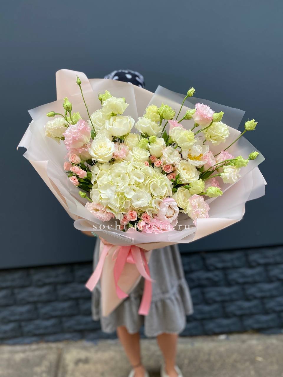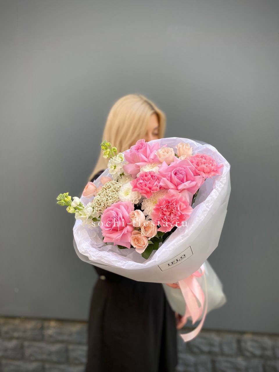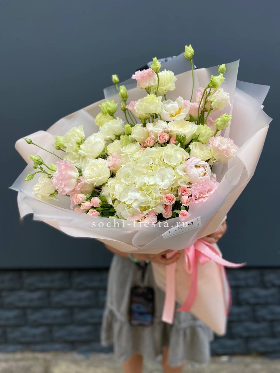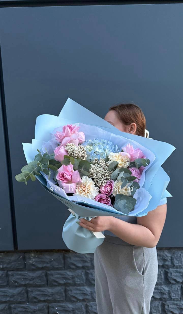 маттиола, розы, гортензия, диантусы, хризантемы , лента и дизайнерская пленка.