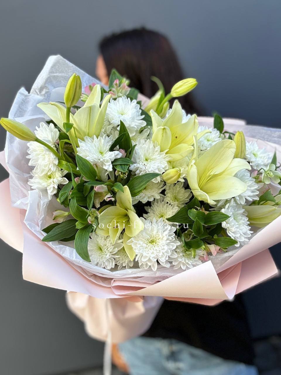 хризантема, лилия, альстромерия (возможна замена от сезона), упаковка.