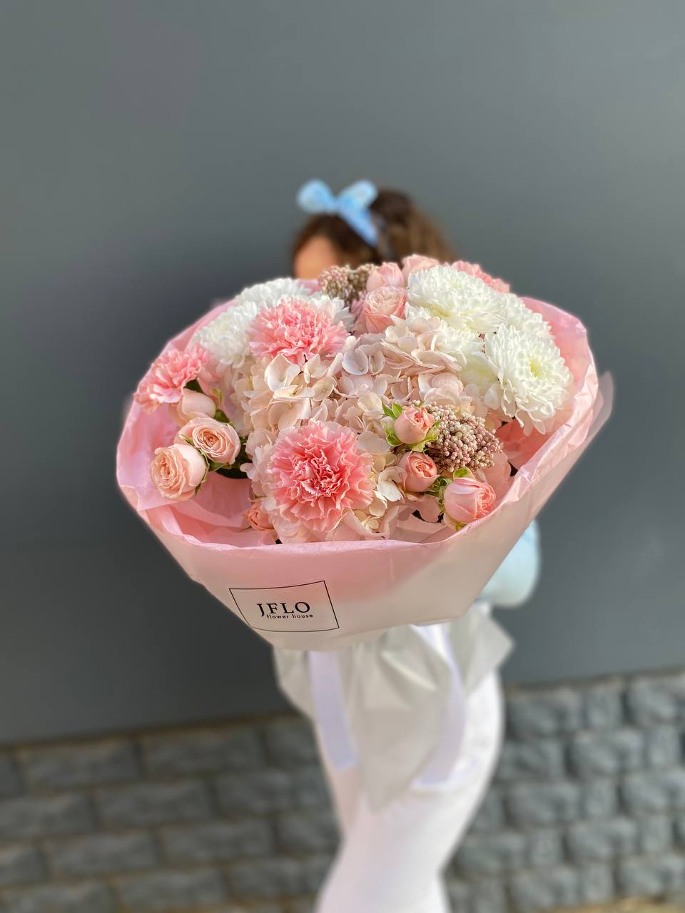 Белоснежная гортензия окружает махровые розы сорта Мисти Бабблс с их густыми лепестками. Композиция построена на игре фактур: воздушные соцветия соседствуют с плотно набитыми бутонами.