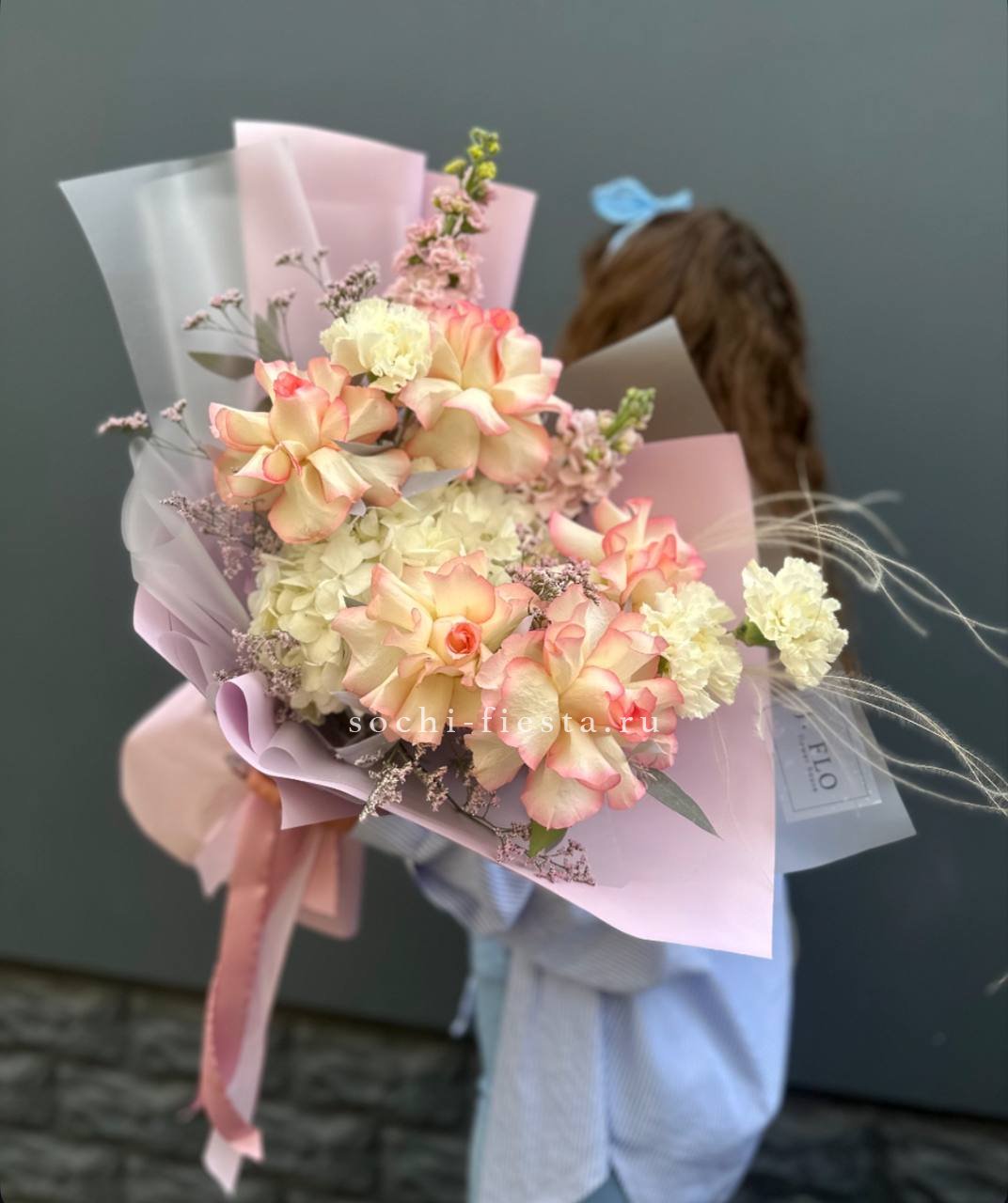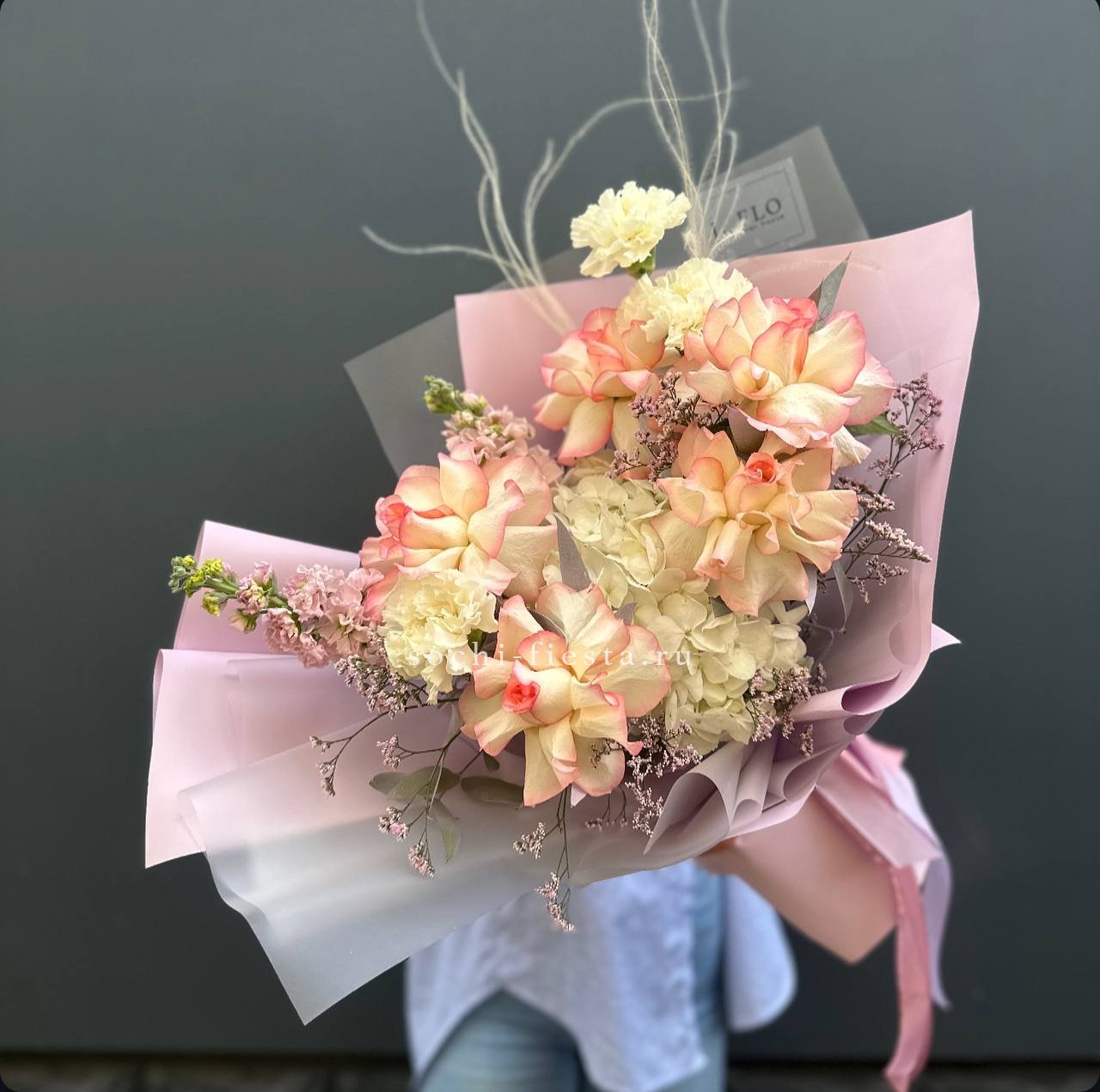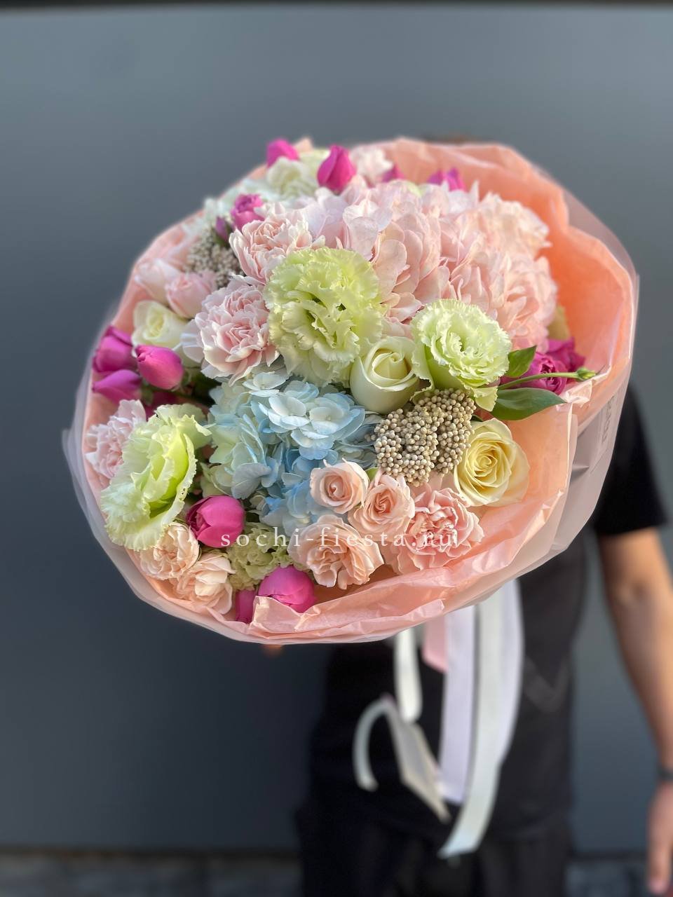 гортензия, эустома, диантус, мисти баблс, озотамус в нежном оформлении.