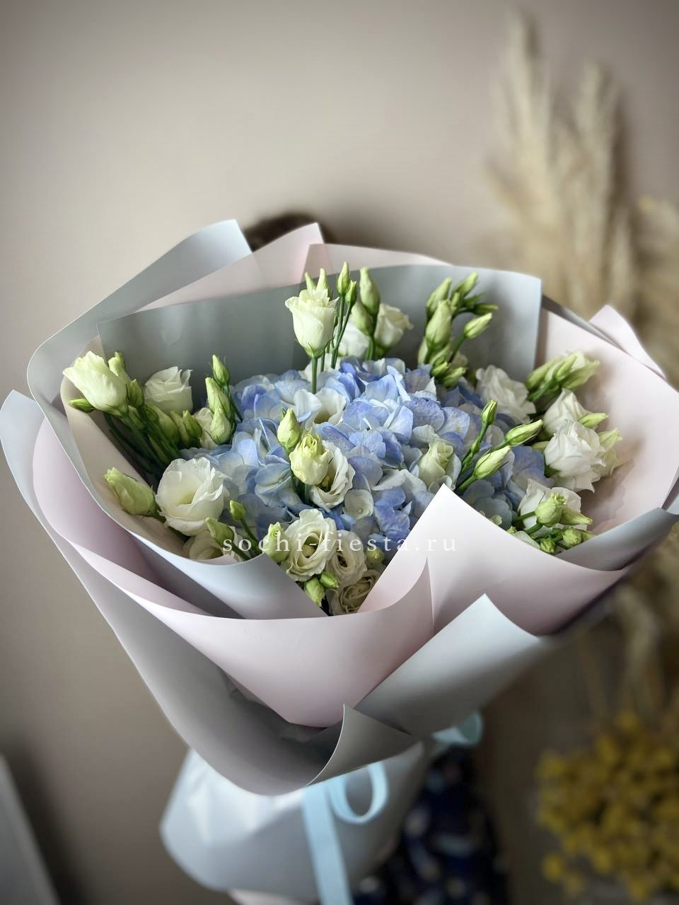 Воздушная композиция собирает кустовую хризантему, эустому и диантус в единый ритм. Озотамус и эвкалипт задают структуру, сохраняя свежесть надолго.