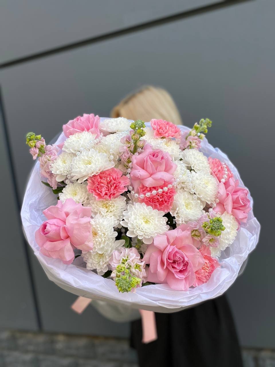 Розовые розы и диантусы окружены пышными соцветиями маттиолы и бомбастика. Композиция собрана плотно, каждый цветок поддерживает соседний, создавая объемную округлую форму. Букет держит силуэт и выглядит цельно с любого ракурса.
