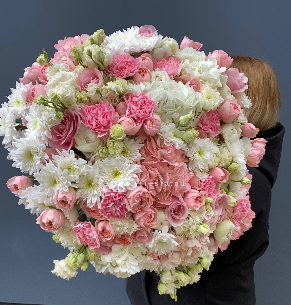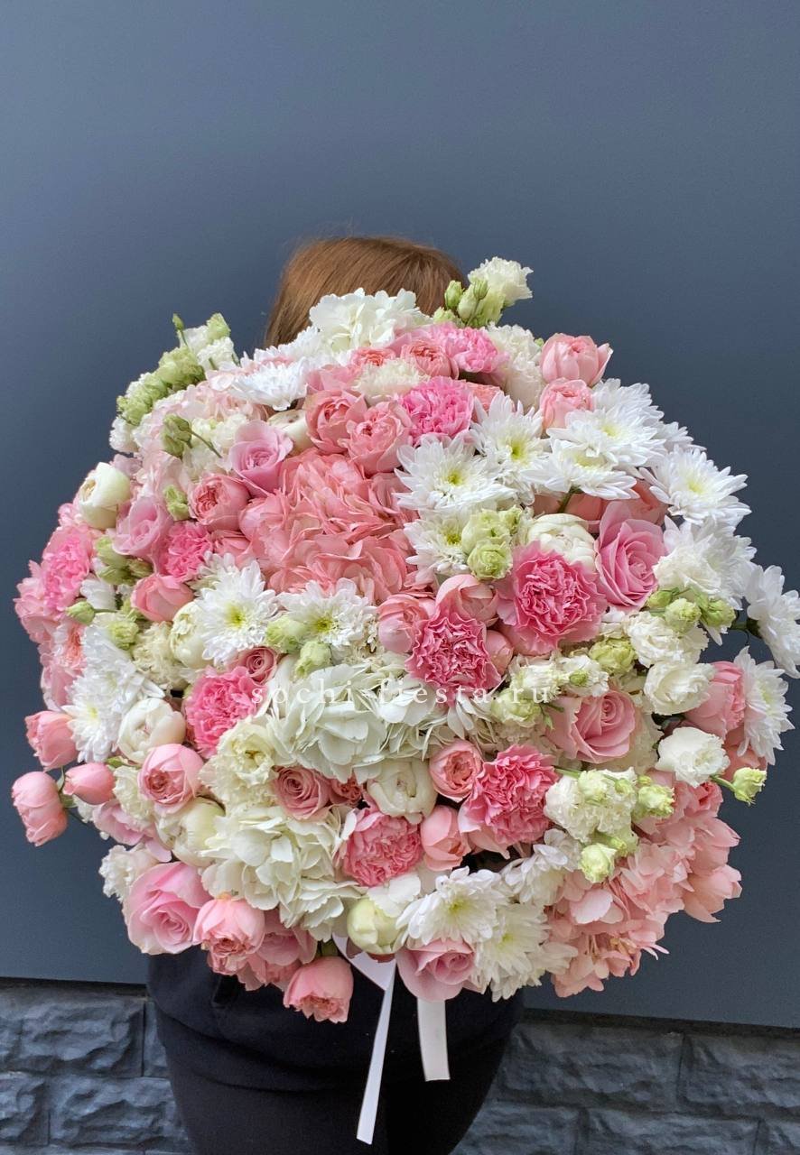 гортензия, белая роза, диантус, хризантема, эустома, озатамус, пленка.