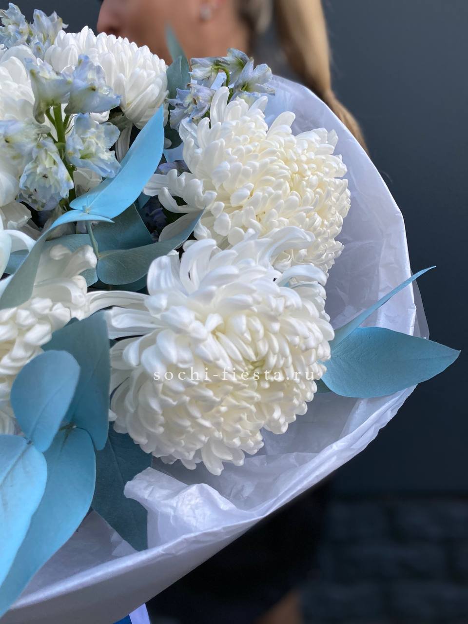 хризантема Бигуди, эвкалипт, дельфиниум, лента, дизайнерская упаковка.