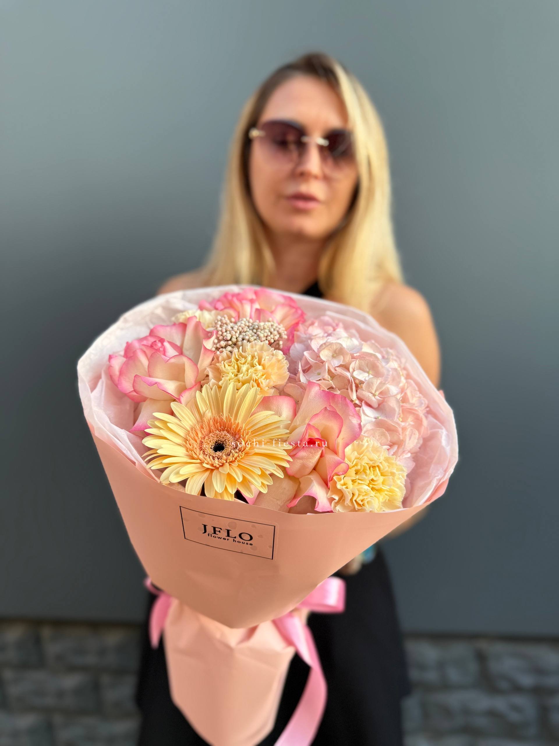 джумилия, диантус, озатамус, гербера, гортензия, пленка.
