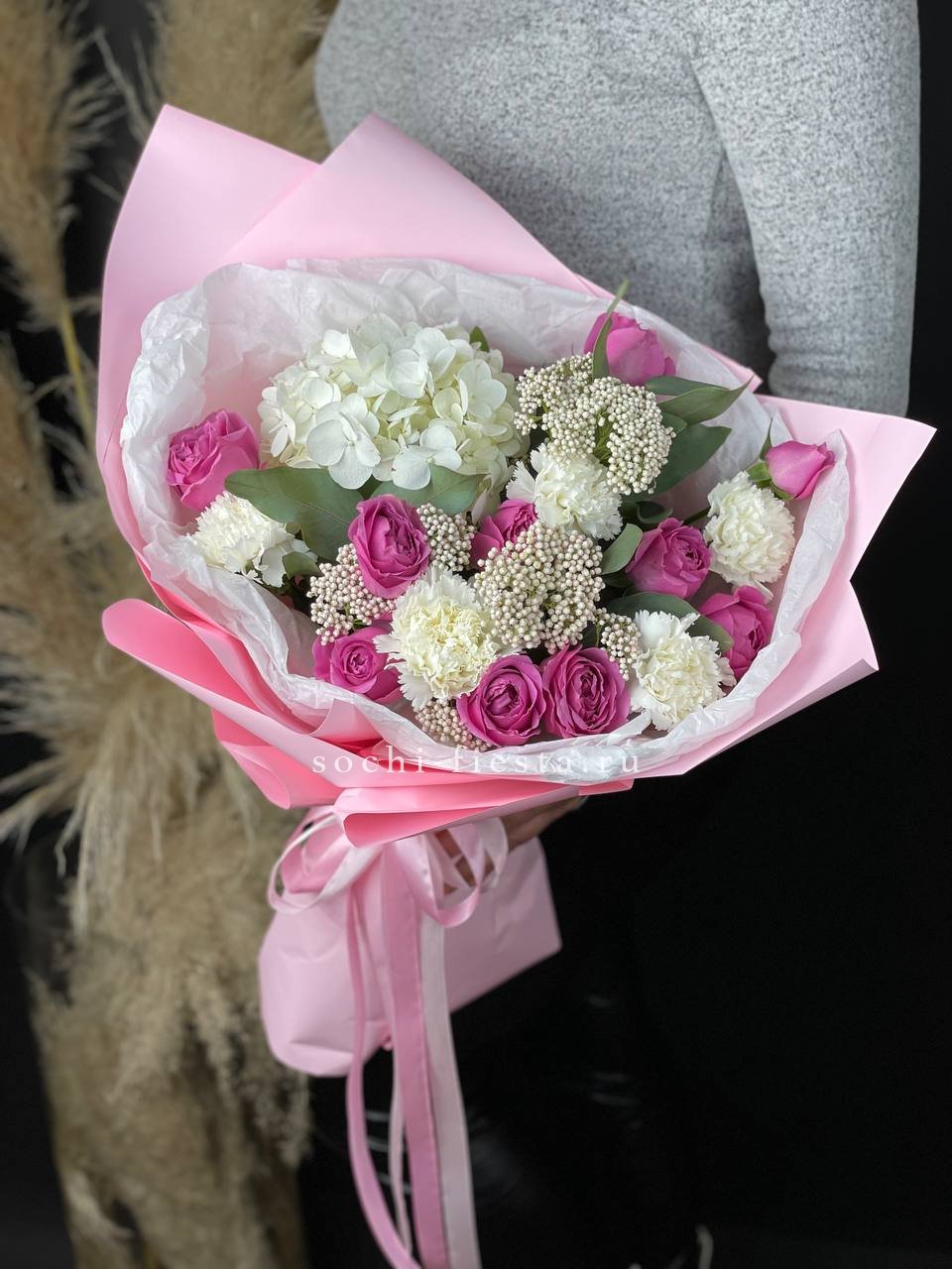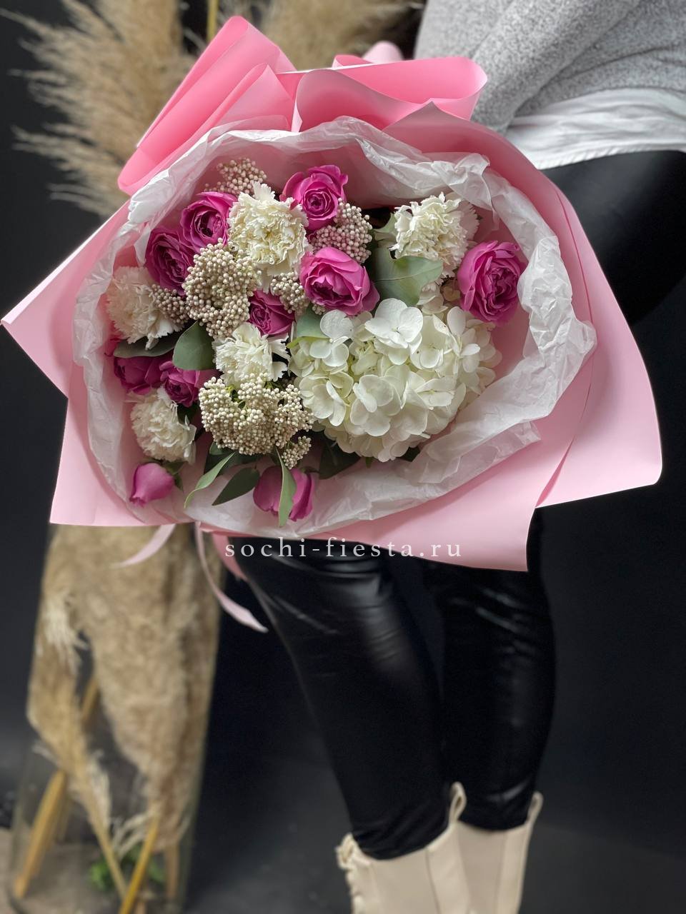 гортензия, розовые розы, кустовые розы, маттиолы,, лимониум лента и дизайнерская пленка.
