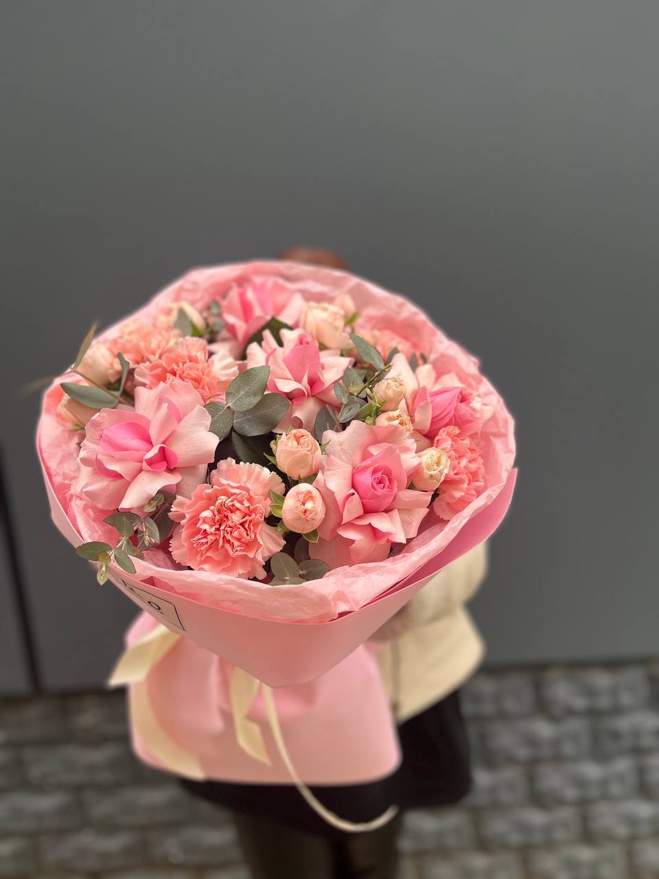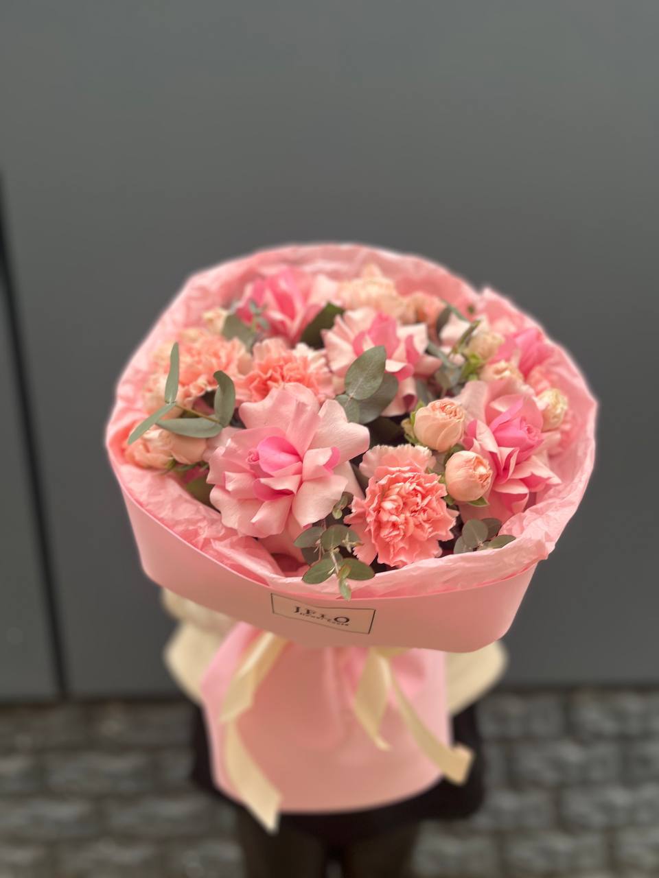 Пионовидные розы и гортензия образуют плотное ядро композиции, а диантус с эустомой разворачиваются по краям. Эвкалипт задает движение и глубину всей формы.