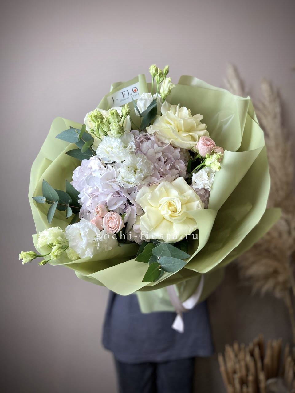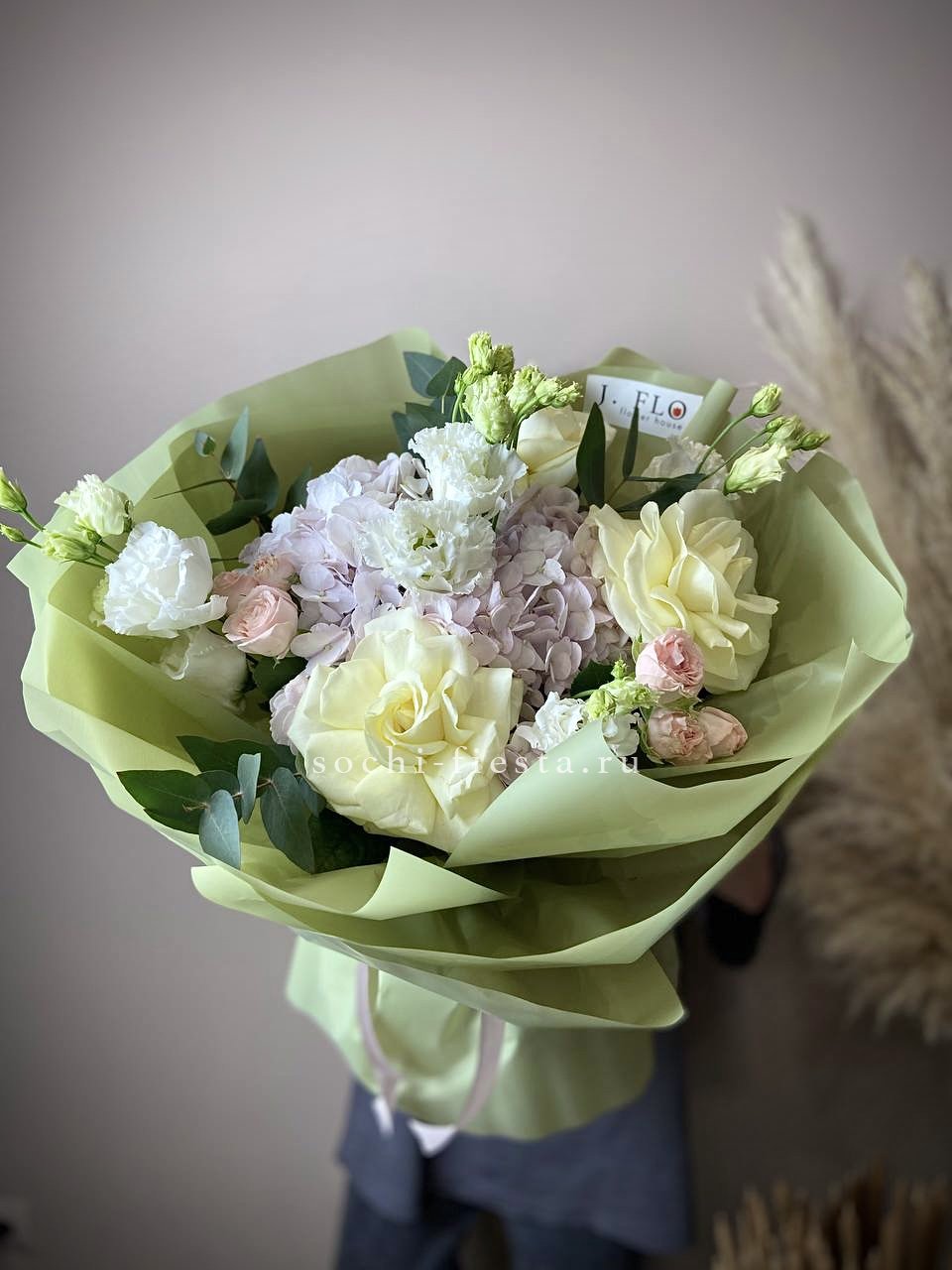 гортензия, диантус, кустовая пионовидная роза, эустома, вспомогательные цветы, эвкалипт, лента, дизайнерская упаковка.