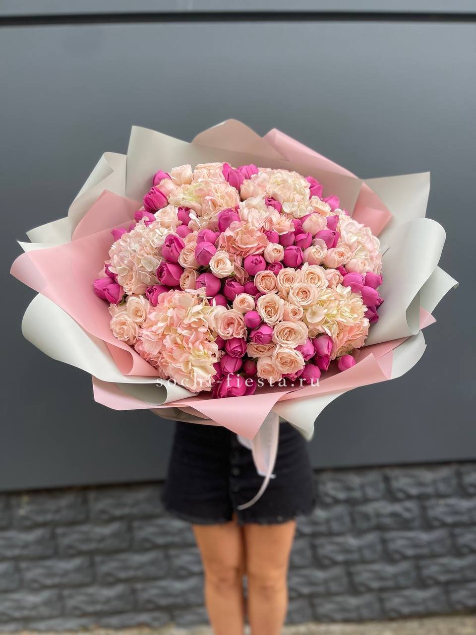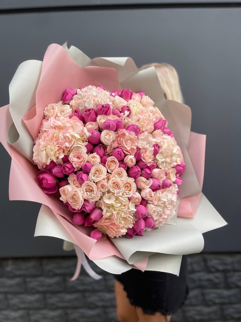 гортензия, гербера, диантус, эустома, свит ревиваль, кустовая роза, эвкалипт, лента, корейская пленка.