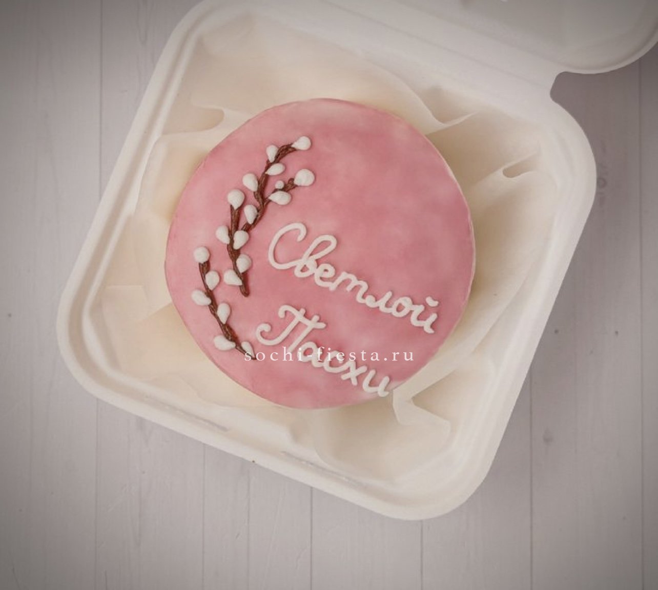 Компактный десерт ручной работы с весенним оформлением в красно-белой гамме. Кремовая текстура и графичный декор создают праздничное настроение. Два варианта начинки позволяют выбрать любимый вкус.